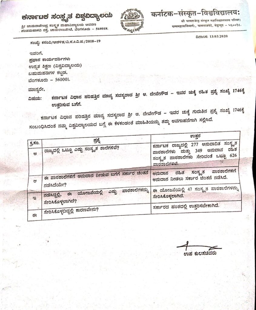 ಸಂಸ್ಕೃತ ಪಾಠಶಾಲೆಗಳಿಗೆ ಒದಗಿಸುತ್ತಿರುವ ಅನುದಾನಕ್ಕೆ ಸಂಬಂಧಿಸಿದಂತೆ ವಿಧಾನಪರಿಷತ್ ಸದಸ್ಯ ಅ ದೇವೇಗೌಡ ಅವರು ಕೇಳಿದ್ದ ಚುಕ್ಕೆ ರಹಿತ ಪ್ರಶ್ನೆಗೆ ಉತ್ತರಿಸಿರುವ ಸಂಸ್ಕೃತ ವಿಶ್ವವಿದ್ಯಾಲಯ, ಅನುದಾನ ರಹಿತ ಸಂಸ್ಕೃತ ಪಾಠಶಾಲೆಗಳಿಗೆ ಅನುದಾನ ಒದಗಿಸಲು ಚಿಂತನೆ ನಡೆಸಿದೆ ಎಂದು ಉನ್ನತ ಶಿಕ್ಷಣ ಇಲಾಖೆ ಸರ್ಕಾರದ ಪ್ರಧಾನ ಕಾರ್ಯದರ್ಶಿಗೆ 2020ರ ಮಾರ್ಚ್ 13ರಂದು ಪತ್ರ ಬರೆದಿದೆ. ಈ ಪತ್ರದ ಪ್ರತಿ ‘ದಿ ಫೈಲ್’ಗೆ ಲಭ್ಯವಾಗಿದೆ.