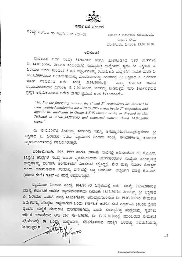 ಬೆಂಗಳೂರು; 1998, 99 ಮತ್ತು 2004ನೇ ಸಾಲಿನ ಕೆಎಎಸ್‌ ಅಧಿಕಾರಿಗಳ ನೇಮಕಾತಿ ಪ್ರಕರಣದಲ್ಲಿ ಸುಪ್ರೀಂ ಕೋರ್ಟ್‌, ಹೈಕೋರ್ಟ್‌ ಮತ್ತು ಕರ್ನಾಟಕ ಆಡಳಿತ ನ್ಯಾಯ ಮಂಡಳಿ ನೀಡಿದ್ದ ಯಾವ ತೀರ್ಪನ್ನು ಪಾಲಿಸದೇ ನ್ಯಾಯಾಂಗ ನಿಂದನೆಗೆ ಗುರಿಯಾಗಿರುವ ರಾಜ್ಯ ಸರ್ಕಾರವು, ಲಾಕ್‌ಡೌನ್‌ ನಡುವೆಯೇ ಮುಖ್ಯಮಂತ್ರಿ ಯಡಿಯೂರಪ್ಪ ಅವರಿಗೆ ಆಪ್ತ ಕಾರ್ಯದರ್ಶಿ (1)ಯಾಗಿರುವ ವಿಶ್ವನಾಥ ಪಿ ಹಿರೇಮಠ ಅವರಿಗಷ್ಟೇ ಸೀಮಿತಗೊಳಿಸಿ ಗ್ರೂಪ್‌-ಎ (ಕೆಎಎಸ್‌ ಕಿರಿಯ ಶ್ರೇಣಿ) ಹುದ್ದೆಯನ್ನು ಕರುಣಿಸಿದೆ.