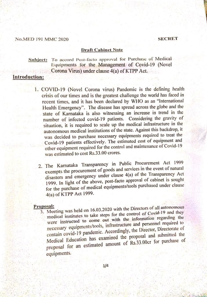 ಇನ್ನು,ವೈದ್ಯಕೀಯ ಪರಿಕರಗಳ ಖರೀದಿಯಲ್ಲಿ ನಡೆದಿದೆ ಎನ್ನಲಾಗಿರುವ ಗಂಭೀರ ಸ್ವರೂಪದ ಅಕ್ರಮಗಳು ಮತ್ತು ಖರೀದಿಸಲಾಗಿರುವ ಉಪಕರಣಗಳ ಕುರಿತು ಪ್ರತಿಪಕ್ಷ ನಾಯಕ ಸಿದ್ದರಾಮಯ್ಯ ಅವರು ಲೆಕ್ಕ ಕೇಳಿದ ಬೆನ್ನಲ್ಲೇ ವೈದ್ಯಕೀಯ ಶಿಕ್ಷಣ ಇಲಾಖೆ, ತರಾತುರಿಯಲ್ಲಿ ಘಟನೋತ್ತರ ಅನುಮೋದನೆ ಪಡೆಯಲು ಕಡತವನ್ನು ಸಚಿವ ಸಂಪುಟದ ಮುಂದಿರಿಸಿದೆ. ಇದಕ್ಕೆ ಸಂಬಂಧಿಸಿದ ದಾಖಲೆಗಳು ‘ದಿ ಫೈಲ್’ಗೆ ಲಭ್ಯವಾಗಿದೆ.