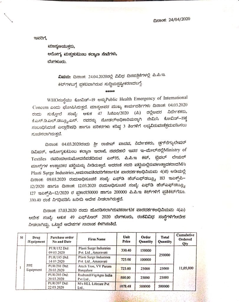 2020ರ ಏಪ್ರಿಲ್‌ 16ರವರೆಗೆ 5,92, 2, 560 ಕೋಟಿ ರು.ಗೆ ಒಟ್ಟು 693 ವೆಂಟಿಲೇಟರ್‌ಗಳನ್ನು ಖರೀದಿ ಮಾಡಿದೆ ಎಂದು ಪ್ರತಿಪಕ್ಷ ನಾಯಕರಿಗೆ ಆರೋಗ್ಯ ಇಲಾಖೆ ಉತ್ತರ ಒದಗಿಸಿತ್ತು. ಇದರಲ್ಲಿಯೂ ಪ್ರತಿ ವೆಂಟಿಲೇಟರ್‌ನ ನಿರ್ದಿಷ್ಟತೆ ಬಗ್ಗೆ ವಿವರಗಳು ಇರಲಿಲ್ಲ. ಅಲ್ಲದೆ ವಿಭಿನ್ನ ದರಗಳಲ್ಲಿ ವೆಂಟಿಲೇಟರ್‌ಗಳನ್ನು ಖರೀದಿಸಿರುವ ಬಗ್ಗೆಯೂ ಸಮರ್ಥನೆ ಒದಗಿಸದ ಸಚಿವದ್ವಯರು, ತಮಿಳುನಾಡು ಸರ್ಕಾರದಂತೆ ಏಕರೂಪದ ದರದಲ್ಲಿ ವೆಂಟಿಲೇಟರ್‌ಗಳನ್ನೇಕೆ ಖರೀದಿಸಲಿಲ್ಲ ಎಂಬ ಪ್ರಶ್ನೆಗಳಿಗೆ ಉತ್ತರವನ್ನೂ ನೀಡಲಿಲ್ಲ.