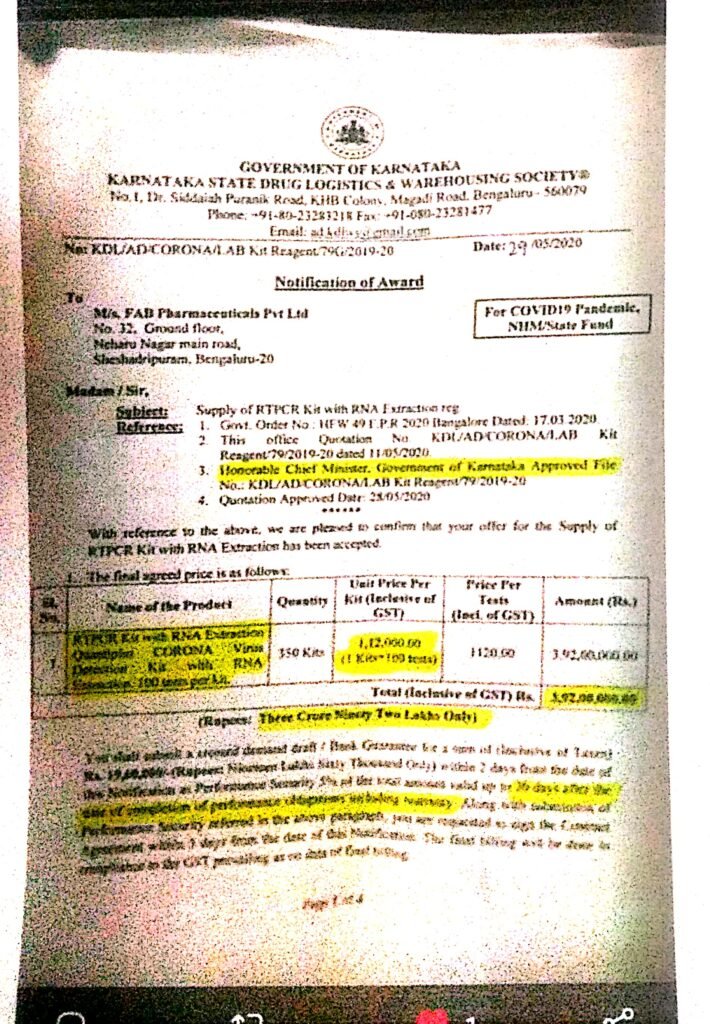 ಆರ್ಎನ್ಎ ಕಿಟ್ ಒಳಗೊಂಡಂತೆ ಆರ್ಟಿಪಿಸಿಆರ್ನ ತಲಾ ಕಿಟ್ಗೆ 1.12 ಲಕ್ಷ ರು. ದರದಲ್ಲಿ ಒಟ್ಟು 350 ಕಿಟ್ಗಳನ್ನು 3.92 ಕೋಟಿ ರು.ಗೆ ಖರೀದಿಸಿದೆ. ಕಿಟ್ವೊಂದರಿಂದ 100 ಟೆಸ್ಟ್ಗಳನ್ನು ಮಾಡಬಹುದು. ಮಾರುಕಟ್ಟೆಯಲ್ಲಿ ಇದೇ ನಿರ್ದಿಷ್ಟತೆಯುಳ್ಳ ಉಪಕರಣವೊಂದರ ದರಕ್ಕಿಂತಲೂ ಹೆಚ್ಚುವರಿ ದರ ನೀಡಿ ಈ ಉಪಕರಣಗಳನ್ನು ಖರೀದಿಸಿದೆ ಎಂಬ ಬಲವಾದ ಆರೋಪ ಕೇಳಿ ಬಂದಿದೆ.