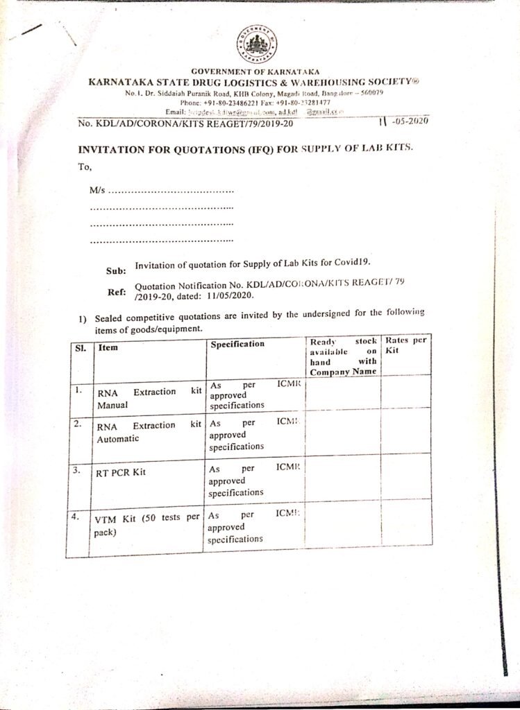 ಆರ್ಎನ್ಎ ಒಳಗೊಂಡಂತೆ ಆರ್ಟಿಪಿಸಿಆರ್ ಕಿಟ್ ಖರೀದಿ ಸಂಬಂಧ ಕರ್ನಾಟಕ ಸ್ಟೇಟ್ ಡ್ರಗ್ ಲಾಜಿಸ್ಟಿಕ್ ಮತ್ತು ವೇರ್ಹೌಸಿಂಗ್ ಸೊಸೈಟಿ ಕರೆದಿದ್ದ ಕೊಟೇಷನ್(ಐಎಫ್ ಕ್ಯೂ)ನಲ್ಲಿ ಭಾಗವಹಿಸುವ ಬಗ್ಗೆ ಕಂಪನಿಗಳಿಗೆ ಕಡಿಮೆ ಕಾಲಾವಕಾಶ ನೀಡಿರುವುದು ಗೊತ್ತಾಗಿದೆ.