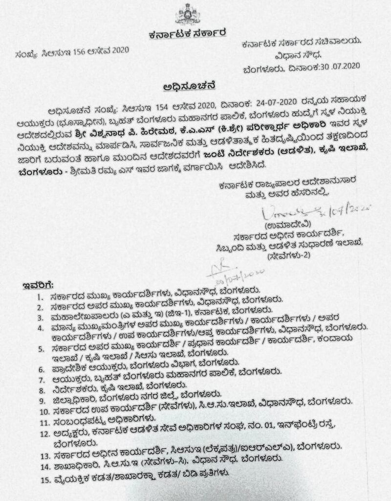 ಬೆಂಗಳೂರು ಮಹಾನಗರ ಪಾಲಿಕೆಯ ಭೂ ಸ್ವಾಧೀನ ವಿಭಾಗದ ಸಹಾಯಕ ಆಯುಕ್ತರ ಹುದ್ದೆಗೆ ನಿಯಮಗಳನ್ನು ಗಾಳಿಗೆ ತೂರಿ ವಿಶ್ವನಾಥ ಹಿರೇಮಠರನ್ನು ನೇಮಿಸಿ ಜುಲೈ 24ರಂದು ಅಧಿಸೂಚನೆ ಹೊರಡಿಸಿತ್ತು ಎಂಬ ಬಲವಾದ ಆರೋಪಗಳು ಕೇಳಿ ಬಂದಿದ್ದವು.