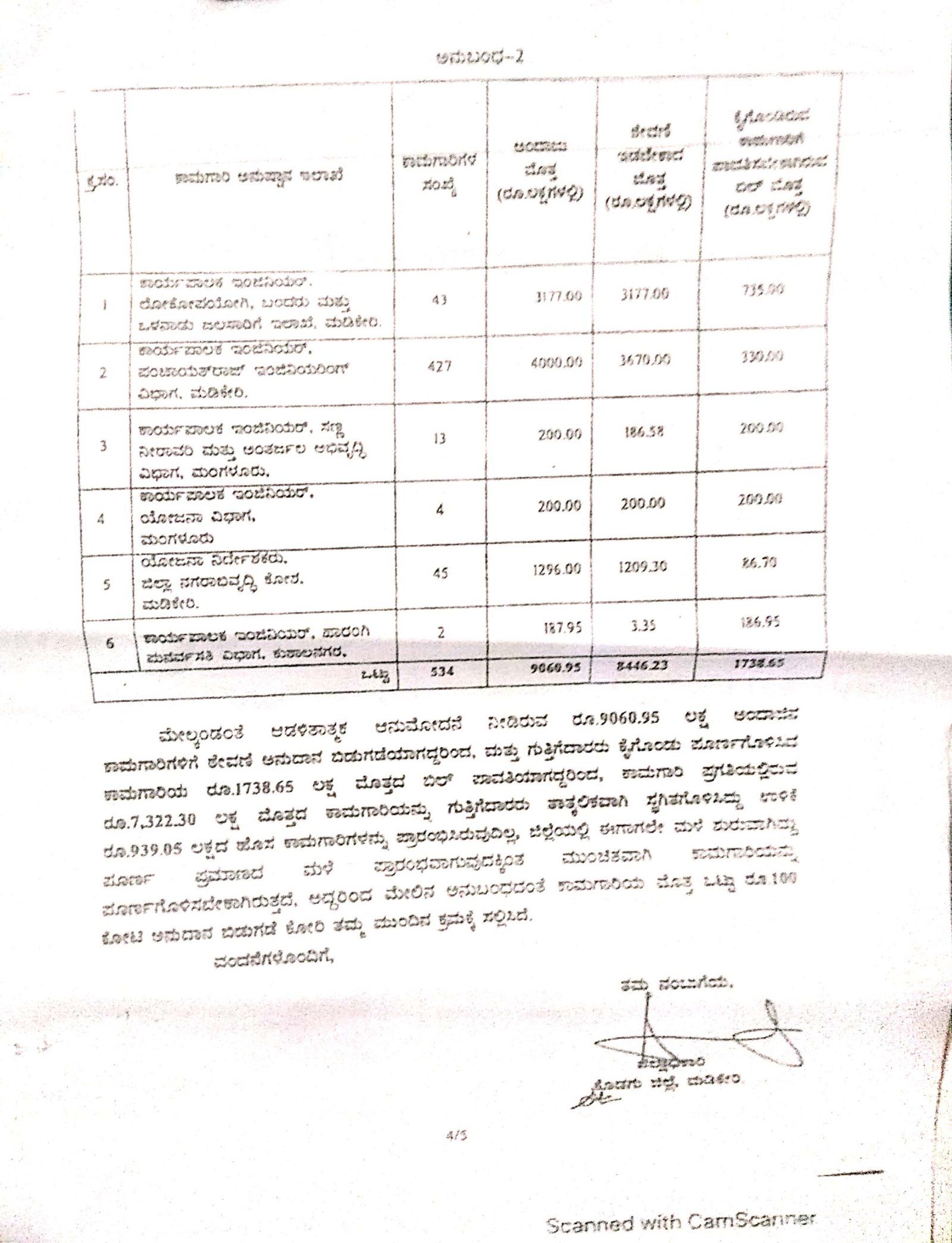 ಲೋಕೋಪಯೋಗಿ, ಗ್ರಾಮೀಣಾಭಿವೃದ್ಧಿ ಪಂಚಾಯತ್‌ ರಾಜ್‌, ಮಹಿಳಾ ಮತ್ತು ಮಕ್ಕಳ ಕಲ್ಯಾಣ, ಪ್ರಾಥಮಿಕ ಪ್ರೌಢಶಿಕ್ಷಣ, ಪಶುಸಂಗೋಪನೆ ಮೀನುಗಾರಿಕೆ, ಸಣ್ಣ ನೀರಾವರಿ, ಕಾವೇರಿ ನೀರಾವರಿ ನಿಗಮ ಸೇರಿದಂತೆ ಇನ್ನಿತರೆ ಇಲಾಖೆಗಳು ಒಟ್ಟು 1,072 ಕಾಮಗಾರಿಗಳನ್ನು ಕೈಗೆತ್ತಿಕೊಂಡಿದ್ದವು.