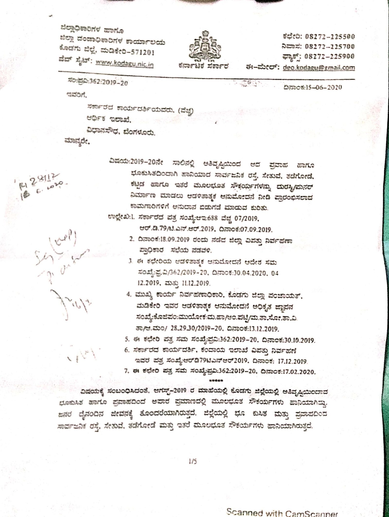 2019ರ ಆಗಸ್ಟ್‌ ನಲ್ಲಿ ಸುರಿದ ಭಾರೀ ಮಳೆಗೆ ತತ್ತರಿಸಿ ಹೋಗಿದ್ದ ಇಡೀ ಕೊಡಗು ಜಿಲ್ಲೆಯನ್ನು ಪುನರ್‌ ರೂಪಿಸುವ ನಿಟ್ಟಿನಲ್ಲಿ ವಿವಿಧ ಕಾಮಗಾರಿಗಳನ್ನು ಕೈಗೆತ್ತಿಕೊಳ್ಳಲು ರಾಜ್ಯ ಸರ್ಕಾರ 100 ಕೋಟಿ ರು.ಗಳ ಮೊತ್ತದ ಕಾಮಗಾರಿಗಳಿಗೆ ಆಡಳಿತಾತ್ಮಕ ಅನುಮೋದನೆ ನೀಡಿತ್ತು. ಆದರೆ ಒಂದು ವರ್ಷದ ಅವಧಿಯಲ್ಲಿ ಕಳೆದ ಸಾಲಿನ ಕಾಮಗಾರಿಗಳೇ ಪೂರ್ಣಗೊಂಡಿಲ್ಲ ಎಂಬ ವಿಚಾರವನ್ನು ಕೊಡಗು ಜಿಲ್ಲಾಧಿಕಾರಿ 2020ರ ಜೂನ್‌ 15ರಂದು ಆರ್ಥಿಕ ಇಲಾಖೆಗೆ ಬರೆದಿರುವ ಪತ್ರ ಅನಾವರಣಗೊಳಿಸಿದೆ. ಈ ಪತ್ರದ ಪ್ರತಿ ‘ದಿ ಫೈಲ್‌’ಗೆ ಲಭ್ಯವಾಗಿದೆ.