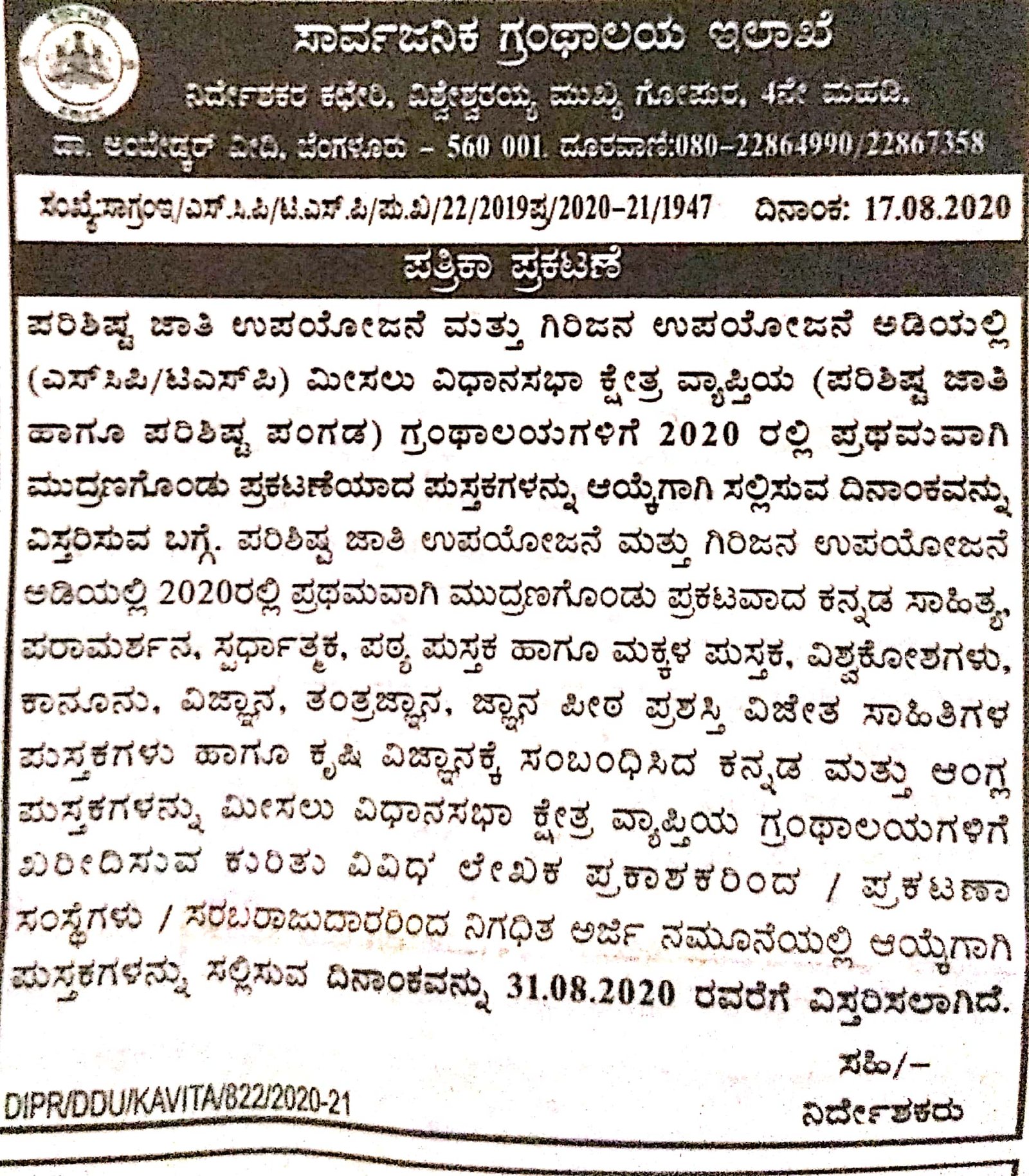 ಬೆಂಗಳೂರು; ಪರಿಶಿಷ್ಟ ಜಾತಿ ಉಪ ಯೋಜನೆ ಹಾಗೂ ಗಿರಿಜನ ಉಪ ಯೋಜನೆ(ಎಸ್‌ಸಿಪಿ/ಟಿಎಸ್‌ಪಿ) ಅಡಿಯಲ್ಲಿ 2020ನೇ ಸಾಲಿನಲ್ಲಿ ಪ್ರಥಮ ಮುದ್ರಣಗೊಂಡ ಪುಸ್ತಕಗಳ ಆಯ್ಕೆಗೆ ಸಂಬಂಧಿಸಿದಂತೆ ಪುಸ್ತಕಗಳನ್ನು ಸಲ್ಲಿಸುವ ಅವಧಿಯನ್ನು ಸಾರ್ವಜನಿಕ ಗ್ರಂಥಾಲಯ ಇಲಾಖೆ ವಿಸ್ತರಿಸಿದೆ.