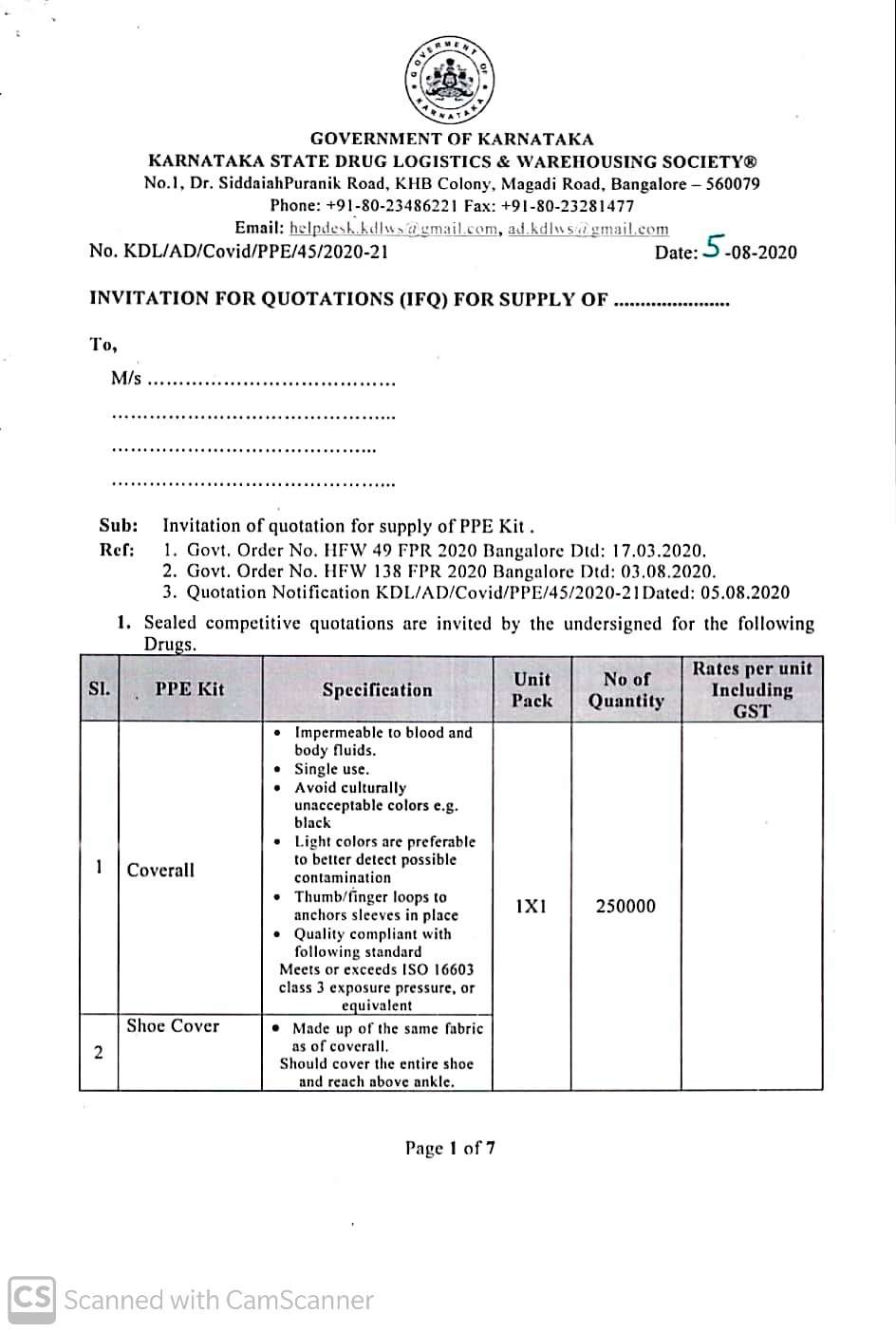 ಆಸಕ್ತ ಕಂಪನಿಗಳು, ಸರಬರಾಜುದಾರರು ದರಪಟ್ಟಿಗಳನ್ನು ಅನ್ಲೈನ್ ಮತ್ತು ಮ್ಯಾನುಯಲ್ ಮೂಲಕ ಸಲ್ಲಿಸಲು 2020ರ ಆಗಸ್ಟ್ 14ರ ಸಂಜೆ 5 ಗಂಟೆವರೆಗೆ ಕಾಲಾವಕಾಶ ನೀಡಲಾಗಿದೆ. ಏಕಕಾಲಕ್ಕೆ ಆನ್ಲೈನ್ ಮತ್ತು ಮ್ಯಾನುಯಲ್ ಮೂಲಕ ದರಪಟ್ಟಿಗಳನ್ನು ಸಲ್ಲಿಸಲು ಅನುವು ಮಾಡಿಕೊಟ್ಟಿರುವ ಪ್ರಕ್ರಿಯೆಯೇ ಅಕ್ರಮಗಳಿಗೆ ದಾರಿಮಾಡಿಕೊಟ್ಟಿದೆ ಎಂಬ ಮಾತು ಕೇಳಿ ಬರುತ್ತಿದೆ. ಇನ್ನು, ಮೊದಲು ಆಹ್ವಾನಿಸುವ ದರಪಟ್ಟಿಯಲ್ಲಿ 15,00,00,000.00 ಮೊತ್ತದಲ್ಲಿ 2,50,000 ಪಿಪಿಇ ಕಿಟ್ಗಳ ಖರೀದಿಸಲು ನಮೂದಿಸಲಾಗಿರುತ್ತದೆ.