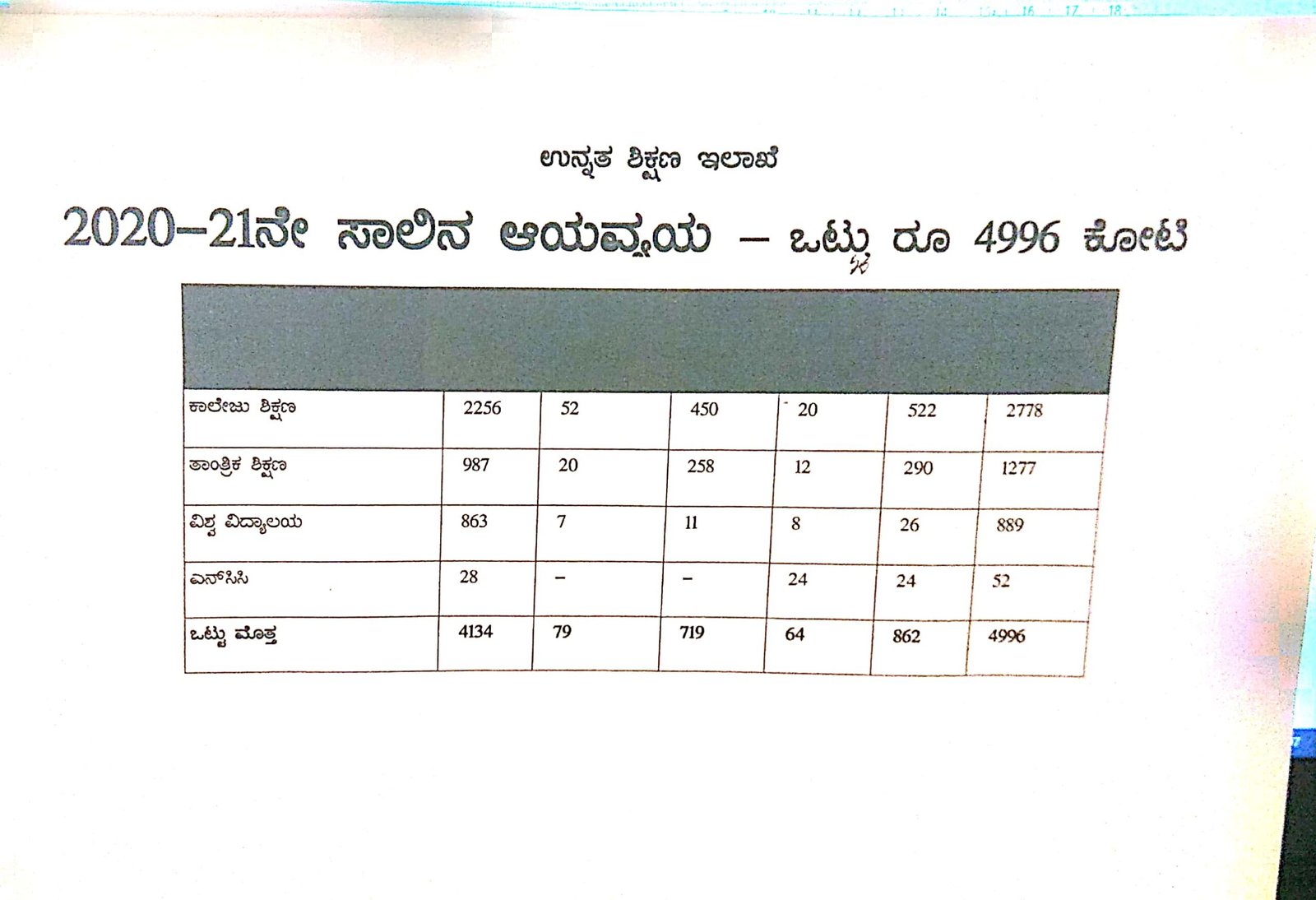 ಕಾಲೇಜು, ತಾಂತ್ರಿಕ, ವಿಶ್ವವಿದ್ಯಾಲಯ ಶಿಕ್ಷಣಕ್ಕೆ ಸಂಬಂಧಿಸಿದಂತೆ ಉನ್ನತ ಶಿಕ್ಷಣ ಇಲಾಖೆಯು 2020-21ನೇ ಸಾಲಿನ ಆಯವ್ಯಯದಲ್ಲಿ ಒಟ್ಟು 4,996 ಕೋಟಿ ರು.ನಿಗದಿಪಡಿಸಿರುವುದು ಗೊತ್ತಾಗಿದೆ. ಉನ್ನತ ಶಿಕ್ಷಣ ಇಲಾಖೆಯ ವಿವಿಧ ವಿಭಾಗಗಳ ಲೆಕ್ಕ ಶೀರ್ಷಿಕೆಯಲ್ಲಿ ಸಾವಿರಾರು ಕೋಟಿ ರು.ಅನುದಾನವಿದ್ದರೂ ಈ ಸಂಬಂಧ ಅಧಿಕಾರಿಗಳು ಕ್ರಿಯಾ ಯೋಜನೆ ರೂಪಿಸದಿರುವುದು ಮತ್ತು ಅನುದಾನ ಬಿಡುಗಡೆ ಕೋರಿ ಸರ್ಕಾರಕ್ಕೆ ಪ್ರಸ್ತಾವನೆಗಳನ್ನೇ ಸಲ್ಲಿಸದಿರುವುದು ಅಧಿಕಾರಿಗಳ ಇಚ್ಛಾಶಕ್ತಿಯೇ ಮೂಲ ಕಾರಣ ಎಂದು ಹೇಳಲಾಗಿದೆ.