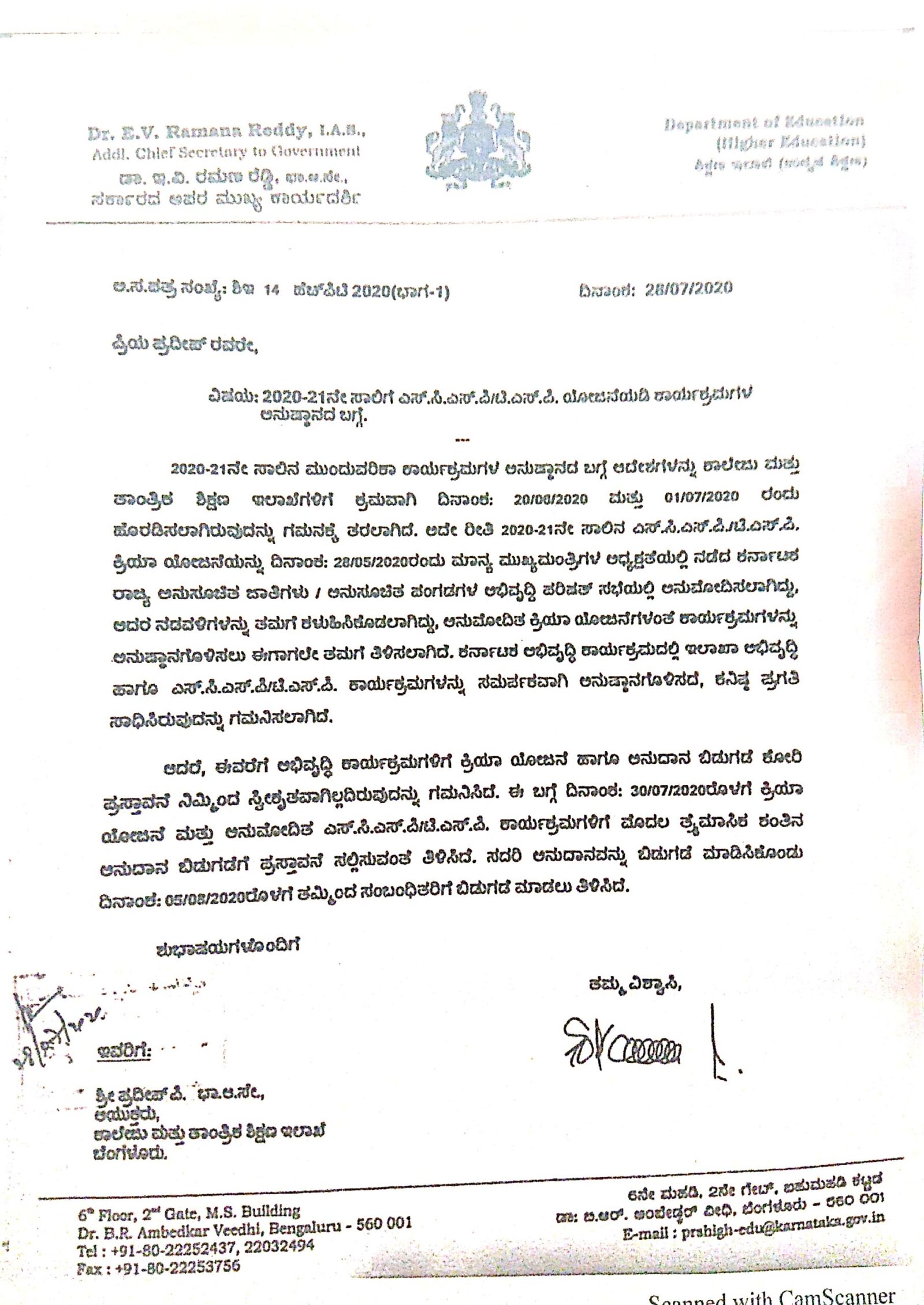 2020-21ನೇ ಸಾಲಿನಲ್ಲಿ ರಾಜ್ಯ ಸರ್ಕಾರ ಎಸ್ಸಿಪಿ/ಟಿಎಸ್ಪಿ ಕಾರ್ಯಕ್ರಮಗಳನ್ನು ಅನುಷ್ಠಾನಗೊಳಿಸಲು ರಾಜ್ಯ ಸರ್ಕಾರ ಅನುದಾನ ಬಿಡುಗಡೆ ಮಾಡಿದ್ದರೂ ಸಮರ್ಪಕವಾಗಿ ಅನುಷ್ಠಾನಗೊಂಡಿಲ್ಲ. ಈ ಕುರಿತು ಉನ್ನತ ಶಿಕ್ಷಣ ಇಲಾಖೆಯ ಸರ್ಕಾರದ ಹೆಚ್ಚುವರಿ ಮುಖ್ಯ ಕಾರ್ಯದರ್ಶಿ ಡಾ ಇ ವಿ ರಮಣರೆಡ್ಡಿ ಅವರು ಕಾಲೇಜು ಮತ್ತು ತಾಂತ್ರಿಕ ಶಿಕ್ಷಣ ಇಲಾಖೆಯ ಆಯುಕ್ತರಿಗೆ 2020ರ ಜುಲೈ 28ರಂದು ಬರೆದಿರುವ ಪತ್ರ, ಎಸ್ಸಿಎಸ್ಪಿ/ಟಿಎಸ್ಪಿ ಕಾರ್ಯಕ್ರಮಗಳ ಅನುಷ್ಠಾನದ ಮೇಲೆ ಬೆಳಕು ಚೆಲ್ಲಿದೆ. ಈ ಪತ್ರದ ಪ್ರತಿ ‘ದಿ ಫೈಲ್’ಗೆ ಲಭ್ಯವಾಗಿದೆ.