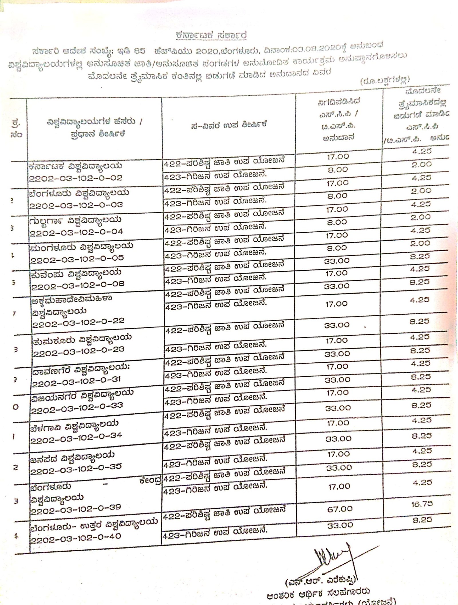 ಕರ್ನಾಟಕ ವಿಶ್ವವಿದ್ಯಾಲಯ ಸೇರಿದಂತೆ ರಾಜ್ಯದ ಎಲ್ಲಾ ವಿಶ್ವವಿದ್ಯಾಲಯಗಳಿಗೆ ಪರಿಶಿಷ್ಟ ಜಾತಿ ಉಪ ಯೋಜನೆ ಮತ್ತು ಗಿರಿಜನ ಉಪಯೋಜನೆ ಲೆಕ್ಕ ಶೀರ್ಷಿಕೆಯಲ್ಲಿ ಮೊದಲ ತ್ರೈಮಾಸಿಕದಲ್ಲಿ ಒಟ್ಟು 601.00 ಲಕ್ಷ ರು.ಗಳನ್ನು ನಿಗದಿಪಡಿಸಿದೆ. ಈ ಪೈಕಿ 150.00 ಲಕ್ಷ ರು. ಆಗಸ್ಟ್ 3ರಂದೇ ಬಿಡುಗಡೆ ಮಾಡಿ ಆದೇಶಿಸಿದೆ.