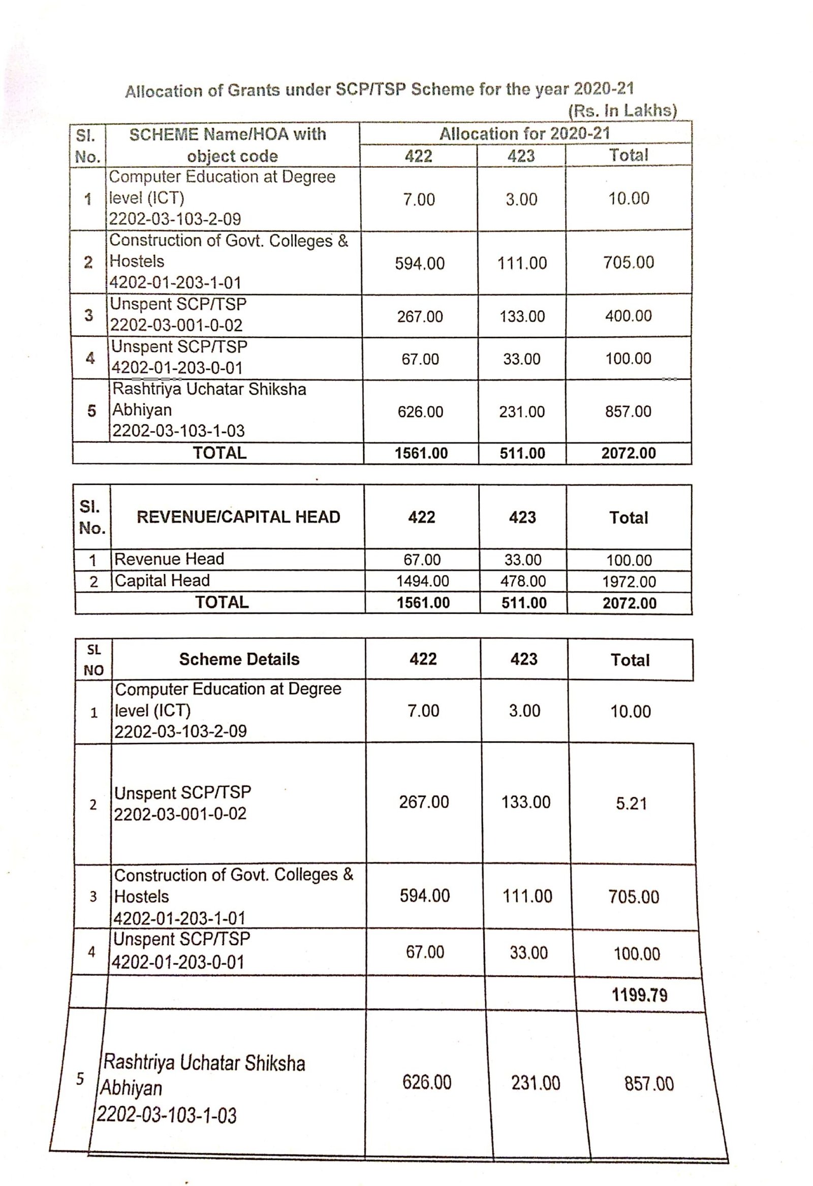 ಹಣ ಬಿಡುಗಡೆ ಅಧಿಕಾರವನ್ನು ಪ್ರತ್ಯಾಯೋಜಿಸಿರುವ ಯೋಜನೆಗಳಿಗೆ ಎದುರಾಗಿ ಮುಂದಿನ 6 ತಿಂಗಳಲ್ಲಿ ಅಂದರೆ ನವೆಂಬರ್ 2020ರವರೆಗೆ ಪರಿಷ್ಕೃತ ಅಂದಾಜಿನ ಅರ್ಧದಷ್ಟು ಮೊತ್ತವನ್ನು ಮಾತ್ರ ಬಳಸಿಕೊಳ್ಳಲು ಅನುಮತಿ ನೀಡಿರುವುದು ದಾಖಲೆಯಿಂದ ತಿಳಿದು ಬಂದಿದೆ. ಕಾಲೇಜು ಶಿಕ್ಷಣದಲ್ಲಿ ಕಂಪ್ಯೂಟರ್ ಶಿಕ್ಷಣ, ಸರ್ಕಾರಿ ಕಾಲೇಜುಗಳು ಮತ್ತು ವಿದ್ಯಾರ್ಥಿ ನಿಲಯಗಳ ನಿರ್ಮಾಣ, ರೂಸಾ ಅನುದಾನದಡಿಲ್ಲಿ 2020-21ನೇ ಸಾಲಿನಲ್ಲಿ ಎಸ್ಸಿಪಿ/ಟಿಎಸ್ಪಿ ಕಾರ್ಯಕ್ರಮಗಳಿಗೆ ಒಟ್ಟು 2072.00 ಲಕ್ಷ ರು.ಗಳನ್ನು ಹಂಚಿಕೆಯಾಗಿದೆ.