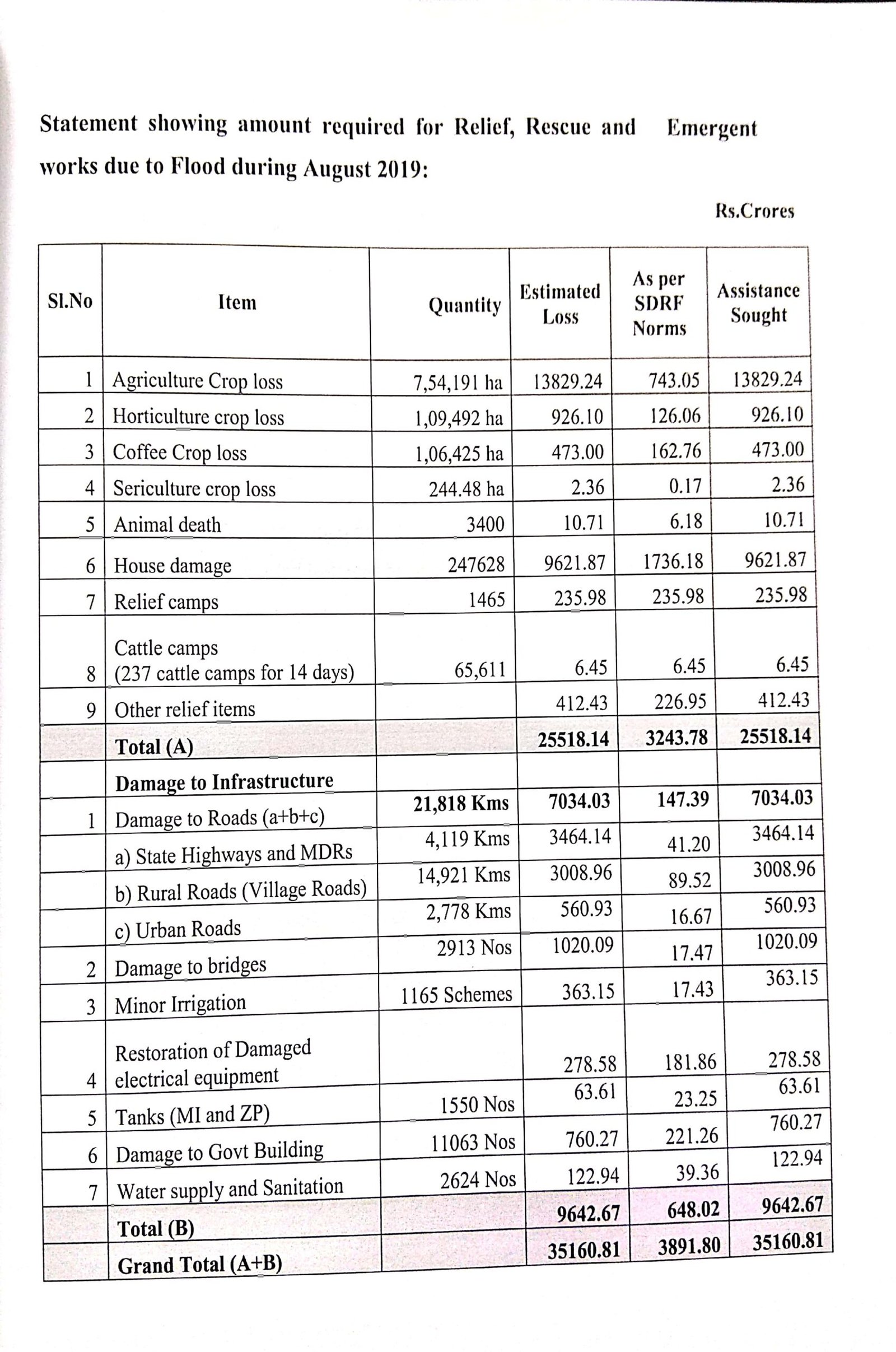 ಕಳೆದ ಆಗಸ್ಟ್ನಲ್ಲಿ ಸಂಭವಿಸಿದ ಭಾರೀ ಮಳೆಯಿಂದಾಗಿ 13,663.51 ಹೆಕ್ಟೇರ್ ಪ್ರಮಾಣದಲ್ಲಿ ಕೃಷಿ ಮತ್ತು ತೋಟಗಾರಿಕೆ ಪ್ರದೇಶಗಳಲ್ಲಿದ್ದ ಬೆಳೆಯು ಸಂಪೂರ್ಣ ನಾಶವಾಗಿದೆ. ಈ ಎರಡೂ ವಲಯಗಳಿಂದಲೇ 15,230 ಕೋಟಿ ರು.ನಷ್ಟ ಸಂಭವಿಸಿತ್ತು. ಅಲ್ಲದೆ ರಸ್ತೆ, ಸೇತುವೆ, ಕಟ್ಟಡ, ಮನೆ ಹಾನಿಯೂ ಸೇರಿದಂತೆ ಒಟ್ಟು 35,160.81 ಕೋಟಿ ರು. ನಷ್ಟವಾಗಿದೆ ಎಂದು ಕೇಂದ್ರ ಸರ್ಕಾರಕ್ಕೆ ಮನವಿ ಸಲ್ಲಿಸಿತ್ತು. ನೆರವು ಕೋರಿದ್ದ ಮೊತ್ತಕ್ಕೆ ಎದುರಾಗಿ ಕೇಂದ್ರ ಸರ್ಕಾರವು ಕೇವಲ 1,652 ಕೋಟಿ ಮಾತ್ರ ಬಿಡುಗಡೆ ಮಾಡಿತ್ತು. ಅಲ್ಲದೆ ಒಂದು ವರ್ಷದ ಸಂಭ್ರಮದಲ್ಲಿದ್ದ ಬಿಜೆಪಿ ಸರ್ಕಾರ ನೀಡಿದ್ದ ಜಾಹೀರಾತಿನಲ್ಲಿ ಕೆಂದ್ರ ಸರ್ಕಾರ 1,869 ಕೋಟಿ ನೆರವು ನೀಡಿದೆ ಎಂದು ತಪ್ಪಾಗಿ ಬಿಂಬಿಸಿದೆ ಎಂಬ ಆರೋಪಗಳು ಕೇಳಿ ಬಂದಿವೆ.