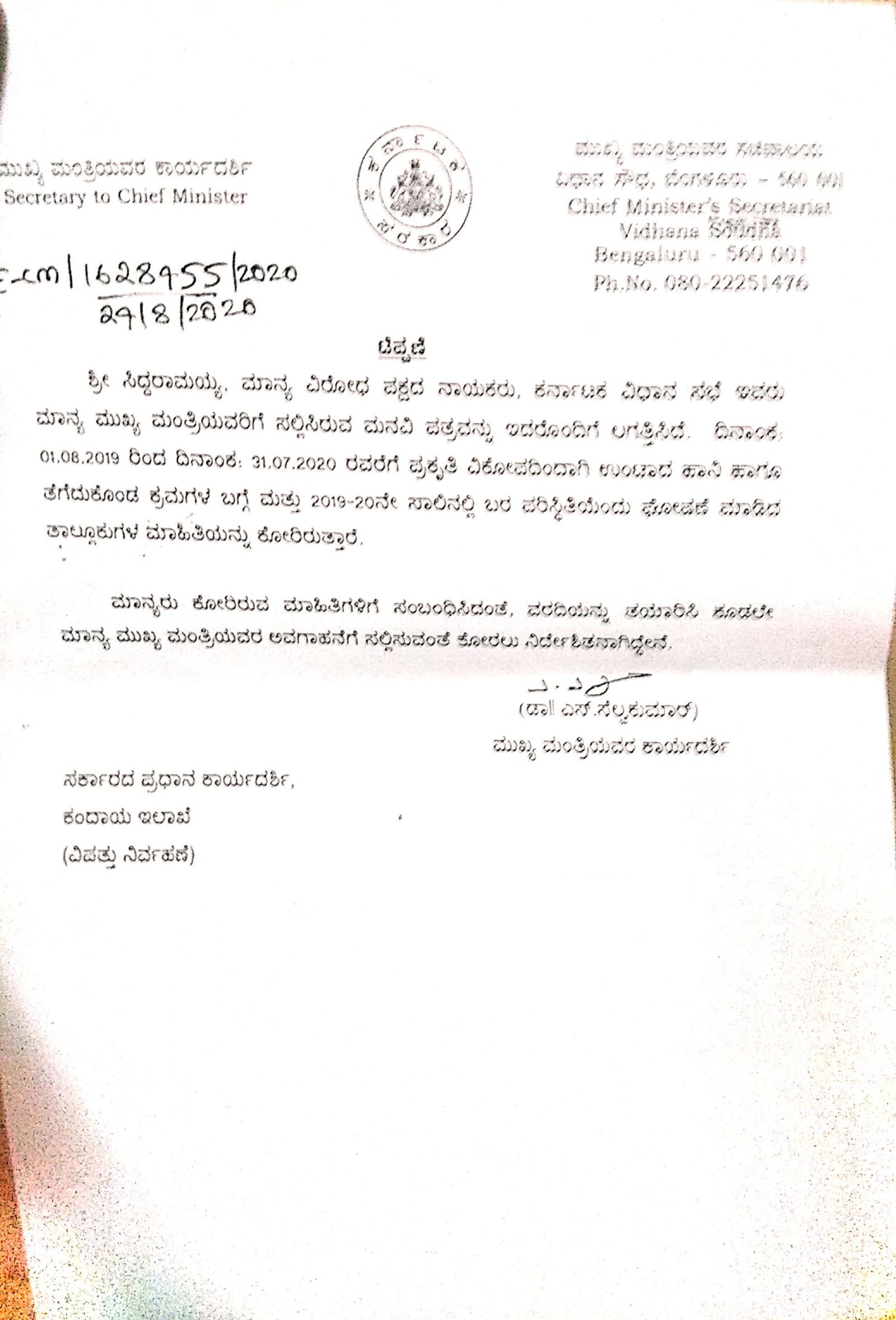 ಅಲ್ಲದೆ ಕಂದಾಯ ಇಲಾಖೆ (ವಿಪತ್ತು ನಿರ್ವಹಣೆ) ಅಧಿಕಾರಿಗಳು ಈ ಕುರಿತು ಮಾಹಿತಿಯನ್ನು ಸಿದ್ದರಾಮಯ್ಯ ಅವರಿಗೆ ತಲುಪಿಸುವ ಮುನ್ನ ಮುಖ್ಯಮಂತ್ರಿ ಯಡಿಯೂರಪ್ಪ ಅವರ ಗಮನಕ್ಕೆ ತರಬೇಕು ಎಂದು ಮುಖ್ಯಮಂತ್ರಿಯವರ ಕಾರ್ಯದರ್ಶಿ ಡಾ ಎಸ್ ಸೆಲ್ವಕುಮಾರ್ ಅವರು ಕಂದಾಯ ಇಲಾಖೆ ಅಧಿಕಾರಿಗಳಿಗೆ ಪತ್ರ ಮುಖೇನ ಸೂಚಿಸಿದ್ದಾರೆ. ಈ ಪತ್ರದ ಪ್ರತಿ ‘ದಿ ಫೈಲ್’ಗೆ ಲಭ್ಯವಾಗಿದೆ.