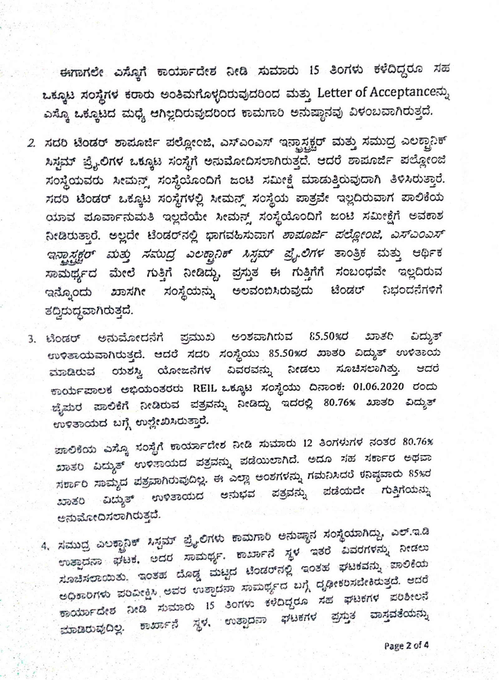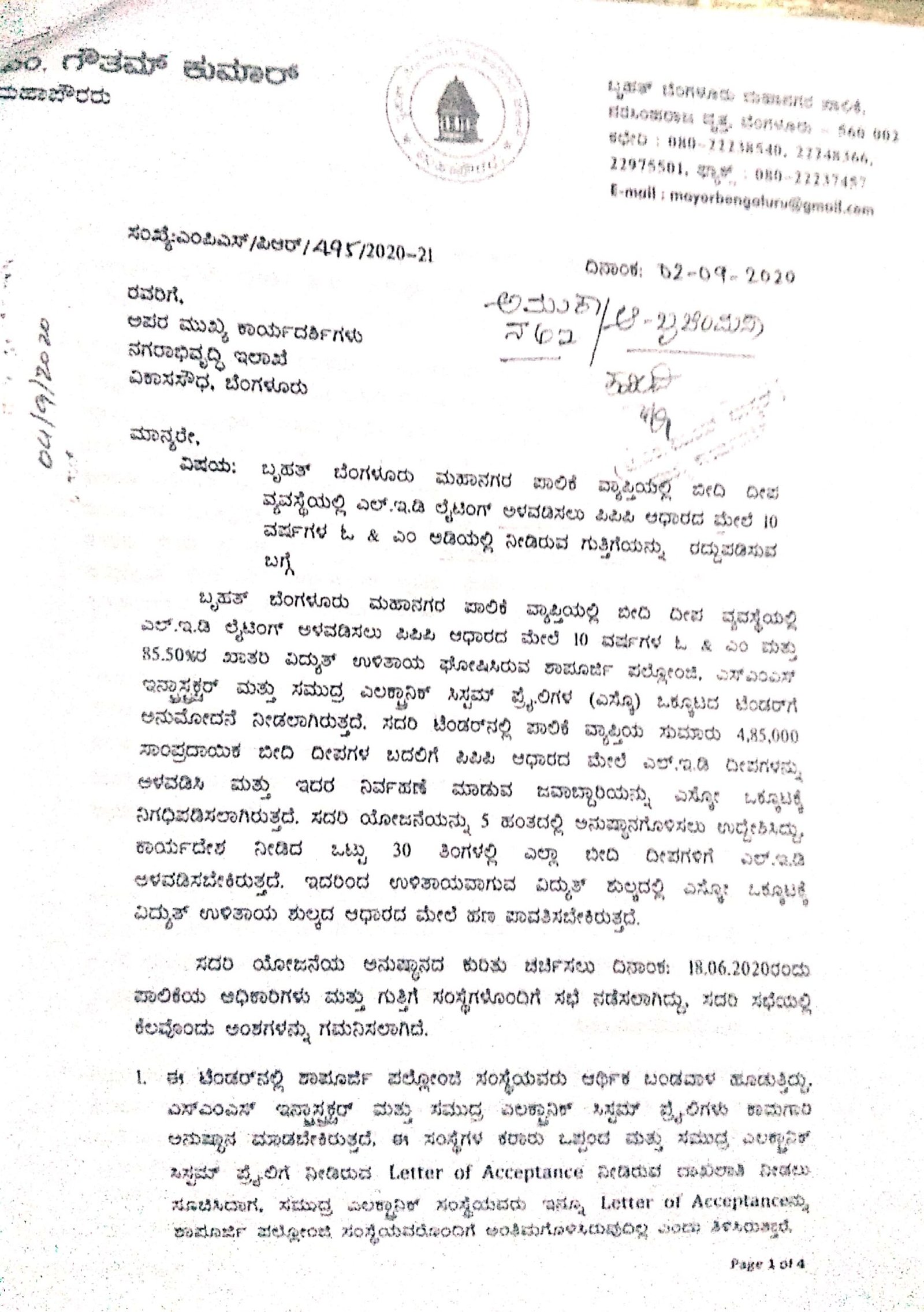 ಆದರೆ ಅದು ಕೂಡ ಸರ್ಕಾರ ಅಥವಾ ಸರ್ಕಾರಿ ಸ್ವಾಮ್ಯದ ಪತ್ರವಲ್ಲ . ಕನಿಷ್ಠ ಶೇ. 85ರಷ್ಟು ಖಾತರಿ ವಿದ್ಯುತ್ ಉಳಿತಾಯದ ಅನುಭವ ಪತ್ರವನ್ನು ಪಡೆಯದೇ ಗುತ್ತಿಗೆಯನ್ನು ಅನುಮೋದಿಸಲಾಗಿದೆ ಎಂದು ಮೇಯರ್ ಪತ್ರ ಮುಖೇನ ಸರ್ಕಾರದ ಗಮನಕ್ಕೆ ತಂದಿದ್ದಾರೆ.