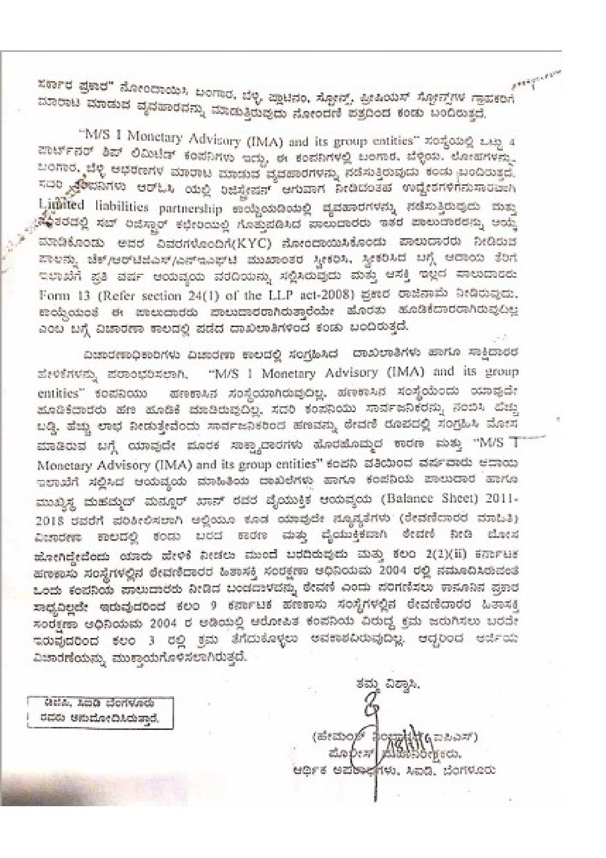 ಕಲಂ 2(2)(ii) ಕರ್ನಾಟಕ ಹಣಕಾಸು ಸಂಸ್ಥೆಗಳಲ್ಲಿನ ಠೇವಣಿದಾರರ ಹಿತಾಸಕ್ತಿ ಸಂರಕ್ಷಣಾ ಅಧಿನಿಯಮ 2004ರಲ್ಲಿ ನಮೂದಿಸಿರುವಂತೆ ಒಂದು ಕಂಪೊನಿಯ ಪಾಲುದಾರರು ನೀಡಿದ ಬಂಡವಾಳವನ್ನು ಠೇವಣಿ ಎಂದು ಪರಿಗಣಿಸಲು ಕಾನೂನಿನ ಪ್ರಕಾರ ಸಾಧ್ಯವಿಲ್ಲದೇ ಇರುವುದರಿಂದ ಕಲಂ 9 ಕರ್ನಾಟಕ ಹಣಕಾಸು ಸಂಸ್ಥೆಗಳಲ್ಲಿನ ಠೇವಣಿದಾರರ ಹಿತಾಸಕ್ತಿ ಸಂರಕ್ಷಣಾ ಅಧಿನಿಯಮ 2004ರ ಅಡಿಯಲ್ಲಿ ಆರೋಪಿತ ಕಂಪನಿಯ ವಿರುದ್ಧ ಕ್ರಮ ಜರುಗಿಸಲು ಬರದೇ ಇರುವುದರಿಂದ ಕಲಂ 3ರಲ್ಲಿ ಕ್ರಮ ತೆಗೆದುಕೊಳ್ಳಲು ಅವಕಾಶವಿರುವುದಿಲ್ಲ. ಆದ್ದರಿಂದ ಅರ್ಜಿಯ ವಿಚಾರಣೆಯನ್ನು ಮುಕ್ತಾಯಗೊಳಿಸಲಾಗಿರುತ್ತದೆ ಎಂದು ಪತ್ರದಲ್ಲಿ ಹೇಮಂತ್ ನಿಂಬಾಳ್ಕರ್ ಅವರು ವಿವರಿಸಿದ್ದರು.
