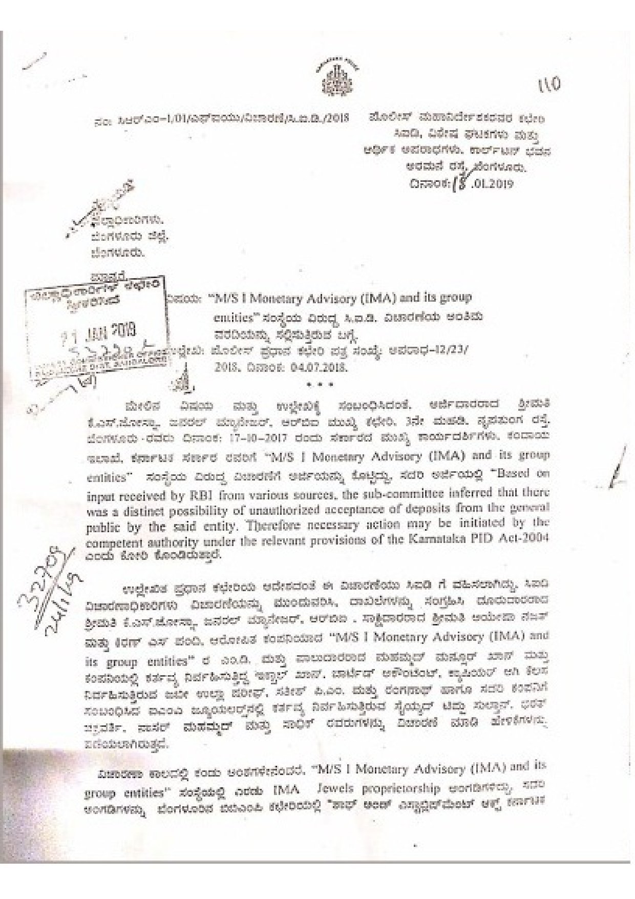 ‘ಐಎಂಎ ಕಂಪನಿಯು ಹಣಕಾಸು ಸಂಸ್ಥೆಗಳ ಅಡಿಯಲ್ಲಿ ಬರುವುದಿಲ್ಲವಾದ ಕಾರಣ ಕೆಪಿಐಡಿ ಕಾಯ್ದೆಯಡಿ ಕ್ರಮ ಕೈಗೊಳ್ಳಲಾಗದು. ಐಎಂಎ ಸಂಗ್ರಹಿಸಿದ ಹಣವನ್ನು ಠೇವಣಿ ಎನ್ನಲಾಗದು ಎಂದು ವಿಚಾರಣೆ ಮುಗಿಸಿ ಷರಾ ಬರೆದು ಡಿಜಿಪಿಗೆ ವರದಿ ಸಲ್ಲಿಸಿದ್ದರು. ಈ ವರದಿಯನ್ನು ಸಕ್ಷಮ ಪ್ರಾಧಿಕಾರವಾಗಿದ್ದ ಬೆಂಗಳೂರು ಉತ್ತರ ವಿಭಾಗದ ಅಂದಿನ ಎ.ಸಿ. ಎಲ್.ಸಿ ನಾಗರಾಜ್ ಅವರಿಗೆ ಡಿಸಿ ಮತ್ತು ಕಂದಾಯ ಇಲಾಖೆ ಪ್ರಧಾನ ಕಾರ್ಯದರ್ಶಿ ಮೂಲಕ ಸಲ್ಲಿಕೆಯಾಗಿತ್ತು. ಈ ಮೂಲಕ ಐಎಂಎ ಕಂಪನಿಯ ಮನ್ಸೂರ್ಖಾನ್ನನ್ನು ಕಾನೂನು ಕ್ರಮಗಳಿಂದ ರಕ್ಷಿಸಲಾಗಿದೆ,’ ಎಂದು ಆರೋಪಿಸಿದ್ದ ಸಿಬಿಐ, ಐಪಿಸಿ ಸೆಕ್ಷನ್ 218 ಅಡಿಯಲ್ಲಿ ವಿಚಾರಣೆ ನಡೆಸದಿರುವುದು ಅನುಮಾನಗಳನ್ನು ಮತ್ತಷ್ಟು ಬಲಗೊಳಿಸಿದಂತಾಗಿದೆ.