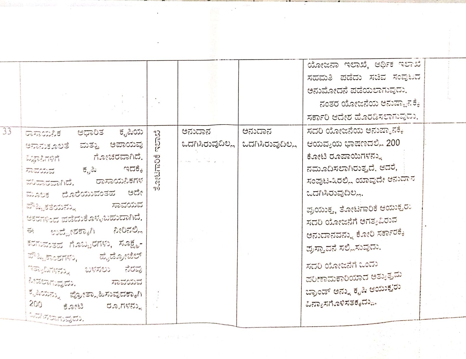 ‘ಯೋಜನೆಯ ಅನುಷ್ಠಾನಕ್ಕೆ ಆಯವ್ಯಯ ಭಾಷಣದಲ್ಲಿ 200 ಕೋಟಿ ರು.ಗಳನ್ನು ನಮೂದಿಸಲಾಗಿರುತ್ತದೆ. ಆದರೆ ಸಂಪುಟ-3ರಲ್ಲಿ ಯಾವುದೇ ಅನುದಾನ ಒದಗಿಸಿರುವುದಿಲ್ಲ,’ ಎಂದು ತೋಟಗಾರಿಕೆ ಇಲಾಖೆ ಅಧಿಕಾರಿಗಳು ಷರಾ ಬರೆದಿದ್ದಾರೆ.