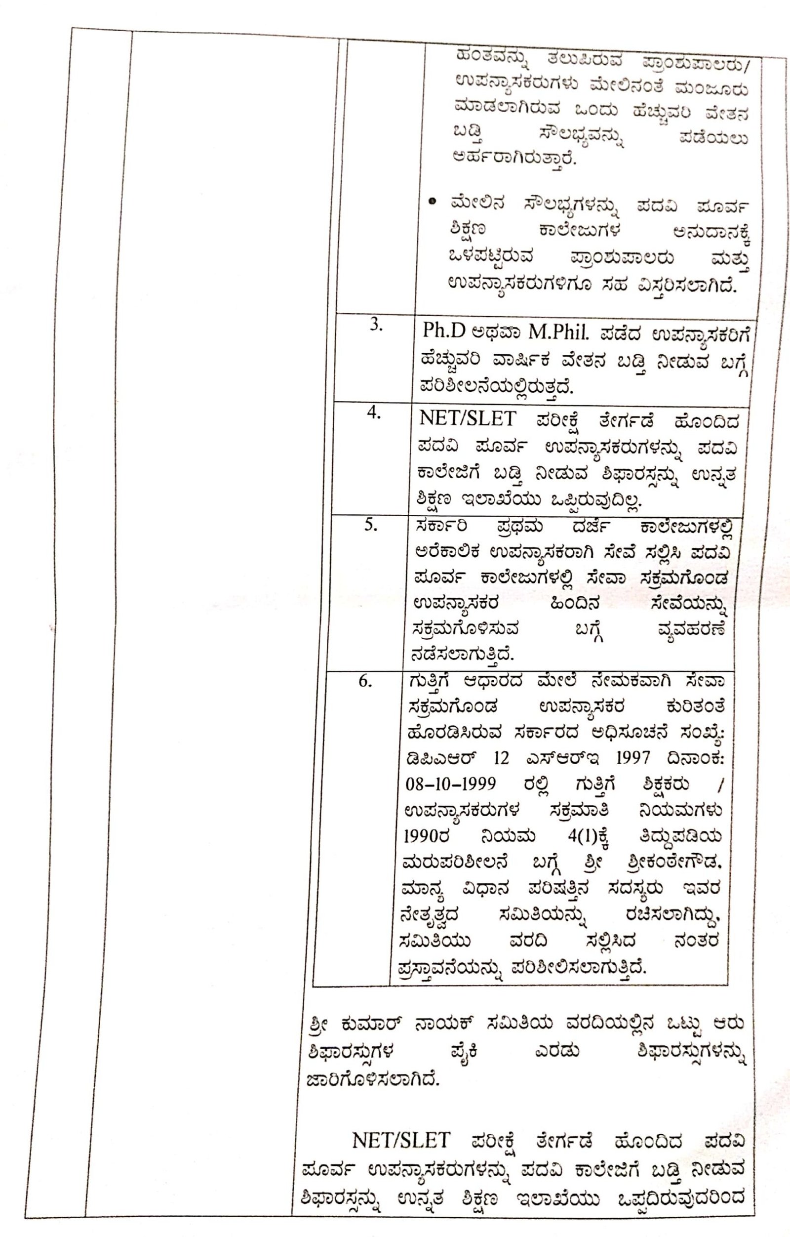 ಎಂ ಫಿಲ್‌ ಪಡೆದ ಉಪನ್ಯಾಸಕರಿಗೆ ಒಂದು ಹೆಚ್ಚುವರಿ ವಾರ್ಷಿಕ ವೇತನ ಬಡ್ತಿ ಹಾಗೂ ಪಿಎಚ್‌ಡಿ ಪಡೆದ ಉಪನ್ಯಾಸಕರಿಗೆ ಎರಡು ಹೆಚ್ಚುವರಿ ವಾರ್ಷಿಕ ವೇತಗನ ಬಡ್ತಿ ಮಂಜೂರು ಮಾಡುವ ಸಂಬಂಧ ಕುಮಾರ್‌ ನಾಯಕ್‌ ಅವರು ಮಾಡಿದ್ದ ಶಿಫಾರಸ್ಸು ಇನ್ನೂ ಸರ್ಕಾರದ ಹಂತದಲ್ಲೇ ಪರಿಶೀಲನೆಯಲ್ಲಿದೆ ಎಂದು ತಿಳಿದು ಬಂದಿದೆ.