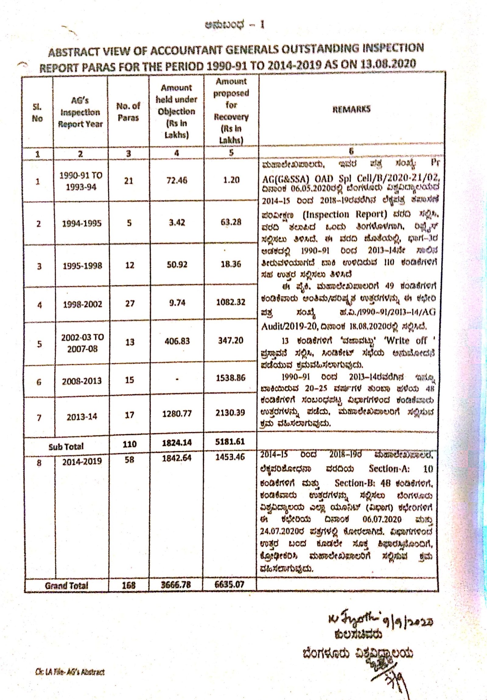 ಬೆಂಗಳೂರು ವಿಶ್ವವಿದ್ಯಾಲಯಕ್ಕೆ ಸಂಬಂಧಿಸಿದಂತೆ ಮಹಾಲೇಖಪಾಲರು 2020ರ ಮೇ 6ರಂದು ಪತ್ರ ಬರೆದಿದ್ದರು. 2014-15ರಿಮದ 2018-19ರವರೆಗಿನ ಲೆಕ್ಕಪತ್ರ ತಪಾಸಣೆ ಪರವಿವೀಕ್ಷಣ ವರದಿ ಸಲ್ಲಿಸಲು ಸೂಚಿಸಿದ್ದರಲ್ಲದೆ ವರದಿ ತಲುಪಿದ ಒಂದು ತಿಂಗಳೊಳಗಾಗಿ ಅನುಸರಣಾ ವರದಿ ಸಲ್ಲಿಸಲು ನಿರ್ದೇಶಿಸಿತ್ತು. ಅಲ್ಲದೆ 1990-91ರಿಂದ 2013-14ನೇ ಸಾಲಿನವರೆಗೂ ತೀರುವಳಿಯಾಗದೇ ಬಾಕಿ ಉಳಿದಿರುವ 110 ಕಂಡಿಕೆಗಳಿಗೆ ಉತ್ತರವನ್ನು ಸಲ್ಲಿಸಲು ಸೂಚಿಸಿತ್ತು.