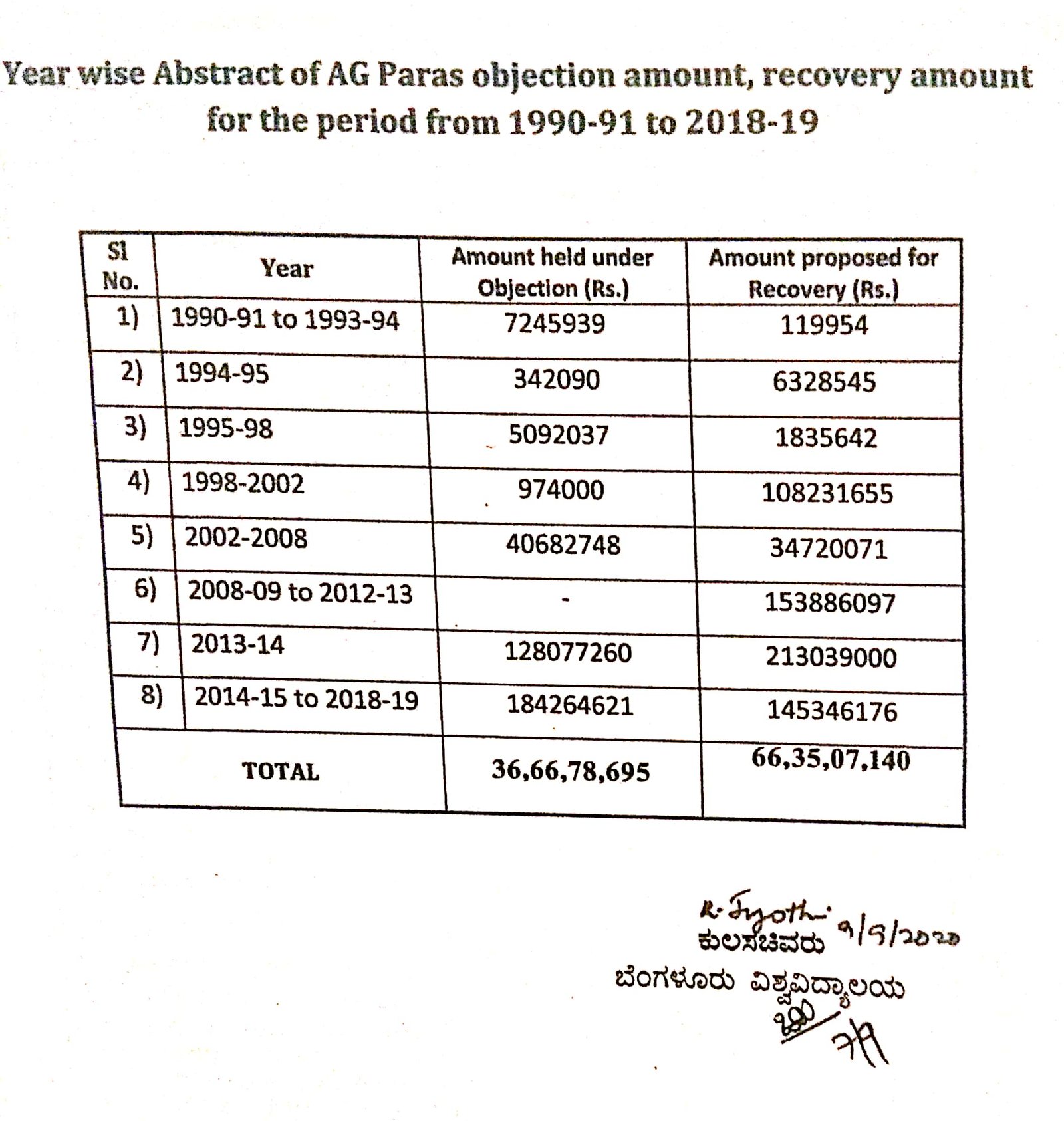 1990-91ರಿಂದ 2014-19ರವರೆಗೆ ಒಟ್ಟು 66,35,07,140 ಕೋಟಿ ರು.ಗಳನ್ನು ವಸೂಲು ಮಾಡಲು ಸಿಎಜಿ ವರದಿ ಸೂಚಿಸಿತ್ತು. ಅಲ್ಲದೆ 36,66,78,695 ರು.ಮೊತ್ತವನ್ನು ಆಕ್ಷೇಪಣೆಯಲ್ಲಿಟ್ಟಿದೆ. ಬೆಂಗಳೂರು ವಿಶ್ವವಿದ್ಯಾಲಯವು ವಸೂಲು ಮಾಡುವ ಗೋಜಿಗೆ ಹೋಗಿಲ್ಲ. ಈ ಕುರಿತು ವಿಶ್ವವಿದ್ಯಾಲಯದ ಕುಲಸಚಿವರು 2020ರ ಸೆ.9ರಂದು ಉನ್ನತ ಶಿಕ್ಷಣ ಇಲಾಖೆಗೆ ಪತ್ರ ಬರೆದಿದ್ದಾರೆ. ಈ ಪತ್ರದ ಪ್ರತಿ ‘ದಿ ಫೈಲ್’ಗೆ ಲಭ್ಯವಾಗಿದೆ.