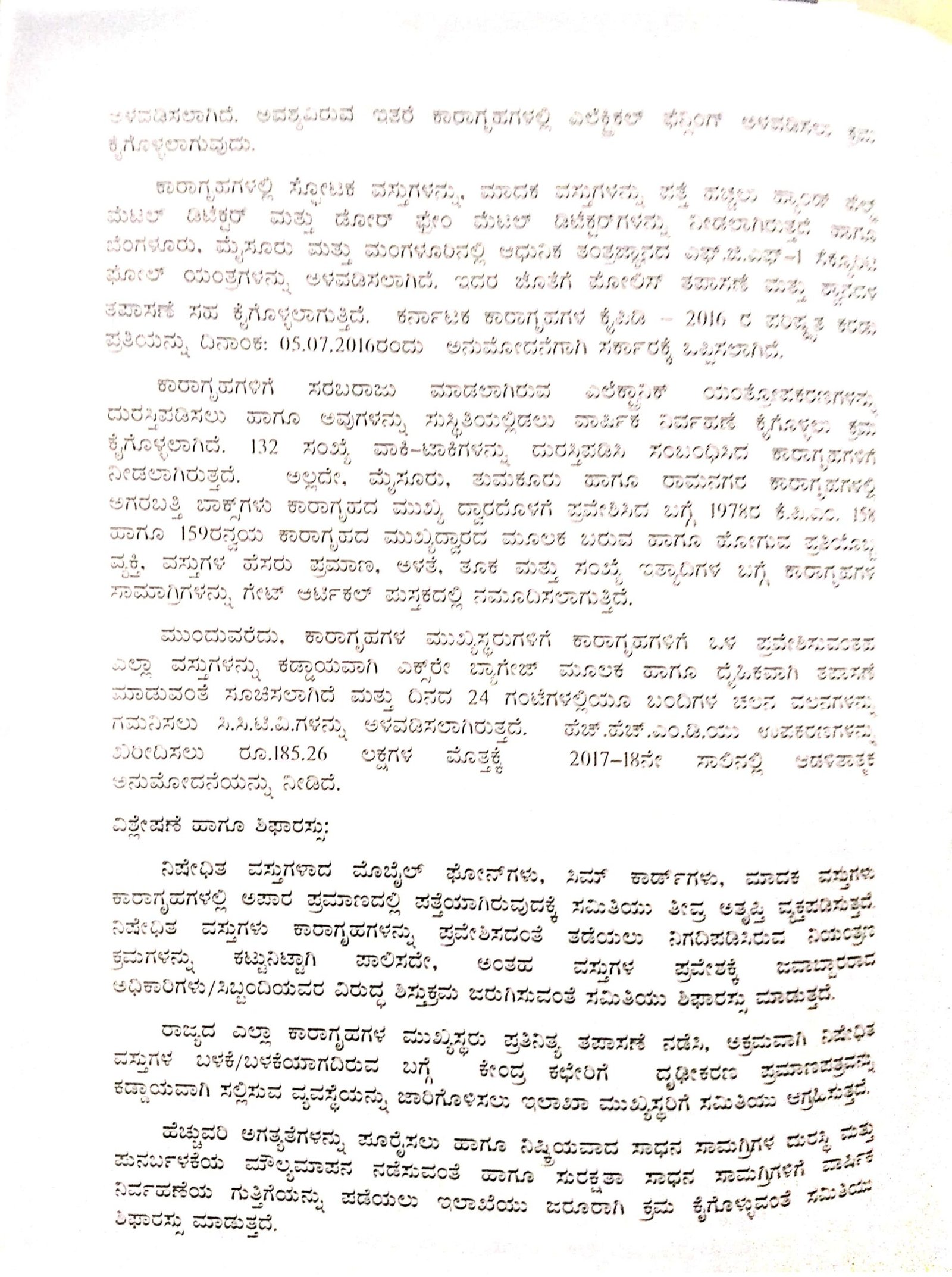 ‘ಮಾದಕ ವಸ್ತುಗಳು, ಮೊಬೈಲ್‌ ಫೋನ್‌, ಸಿಮ್‌ ಕಾರ್ಡ್‌ಗಳು ಕಾರಾಗೃಹಗಳಲ್ಲಿ ಅಪಾರ ಪ್ರಮಾಣದಲ್ಲಿ ಪತ್ತೆಯಾಗಿರುವುದಕ್ಕೆ ಸಮಿತಿಯು ತೀವ್ರ ಅತೃಪ್ತಿ ವ್ಯಕ್ತಪಡಿಸುತ್ತದೆ. ನಿಷೇಧಿತ ವಸ್ತುಗಳು ಕಾರಾಗೃಹಗಳನ್ನು ಪ್ರವೇಶಿಸದಂತೆ ತಡೆಯಲು ನಿಗದಿಪಡಿಸಿರುವ ನಿಯಂತ್ರಣ ಕ್ರಮಗಳನ್ನು ಕಟ್ಟುನಿಟ್ಟಾಗಿ ಪಾಲಿಸದೆ ಅಂತಹ ವಸ್ತುಗಳ ಪ್ರವೇಶಕ್ಕೆ ಜವಾಬ್ದಾರರಾದ ಅಧಿಕಾರಿಗಳು, ಸಿಬ್ಬಂದಿ ವಿರುದ್ಧ ಶಿಸ್ತು ಕ್ರಮ ಜರುಗಿಸಬೇಕು,’ ಎಂದು ಸಾರ್ವಜನಿಕ ಲೆಕ್ಕಪತ್ರ ಸಮಿತಿಯು ಶಿಫಾರಸ್ಸು ಮಾಡಿತ್ತು.
