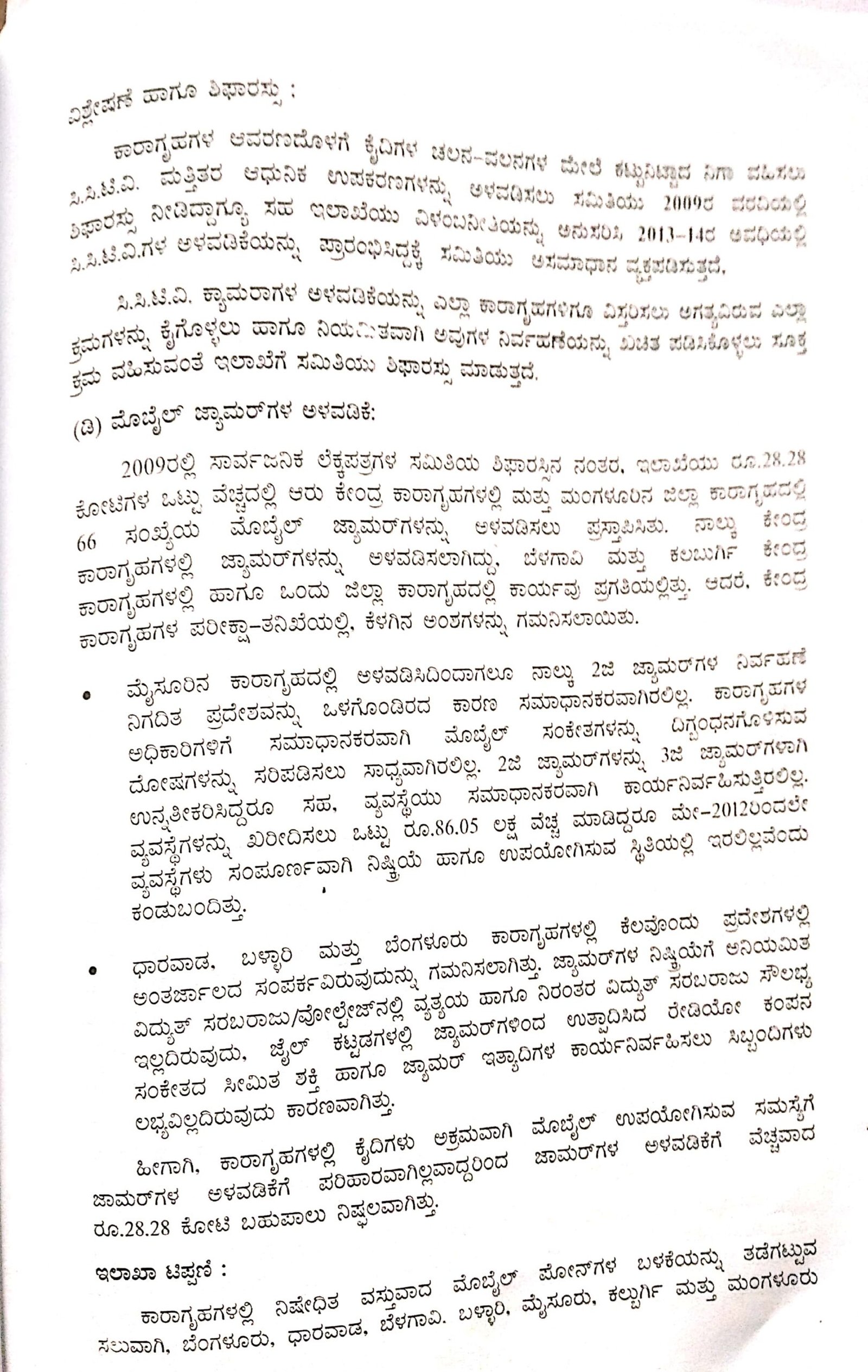ಮೈಸೂರು, ಧಾರವಾಡ, ಬಳ್ಳಾರಿ ಮತ್ತು ಬೆಂಗಳೂರು ಕಾರಾಗೃಹಗಳಲ್ಲಿ ಮೊಬೈಲ್‌ ಜಾಮರ್‌ ಅಳವಡಿಸಲು 28.28 ಕೋಟಿ ರು. ಅನುದಾನ ಒದಗಿಸಲಾಗಿತ್ತು. ಈ ಪೈಕಿ 86.05 ಲಕ್ಷ ವೆಚ್ಚ ಮಾಡಿದ್ದರೂ 2012ರ ಮೇ ತಿಂಗಳಿನಿಂದಲೇ ಮೊಬೈಲ್‌ ಜಾಮರ್‌ಗಳು ಉಪಯೋಗಿಸುವ ಸ್ಥಿತಿಯಲ್ಲಿ ಇರಲಿಲ್ಲ ಎಂದು ಸಿಎಜಿ ವರದಿ ಮಾಡಿತ್ತು.