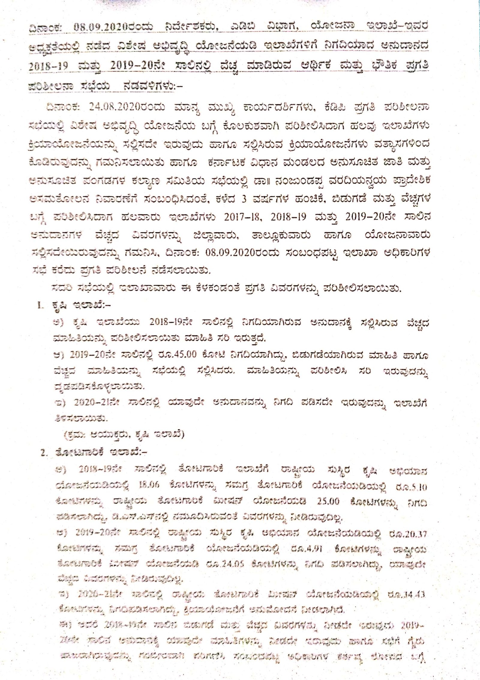 ಯೋಜನಾ ಇಲಾಖೆಯ ಎಡಿಬಿ ವಿಭಾಗ 2020ರ ಸೆ. 8ರಂದು ನಡೆದಿದ್ದ ಸಭೆಯಲ್ಲಿ ಇಲಾಖೆಗಳ ಬಳಿ ಖರ್ಚಿನ ವಿವರಗಳೇ ಇಲ್ಲದಿರುವುದು ಹಲವು ಅನುಮಾನಗಳಿಗೆ ಕಾರಣವಾಗಿದೆ. ವಿಶೇಷ ಅಭಿವೃದ್ಧಿ ಯೋಜನೆಯಡಿ ಕೋಟ್ಯಂತರ ಮೊತ್ತದಲ್ಲಿ ಅನುದಾನ ನೀಡಿದ್ದರೂ ಹಲವು ಇಲಾಖೆಗಳು ಕ್ರಿಯಾ ಯೋಜನೆಗಳನ್ನು ಸಲ್ಲಿಸಿಲ್ಲ. ಅಲ್ಲದೆ ಸಲ್ಲಿಸಿರುವ ಕ್ರಿಯಾ ಯೋಜನೆಗಳು ವ್ಯತ್ಯಾಸಗಳಿಂದ ಕೂಡಿವೆ ಎಂಬುದು ಗೊತ್ತಾಗಿದೆ. ಸಭೆ ನಡವಳಿಯ ಪ್ರತಿ ‘ದಿ ಫೈಲ್’ಗೆ ಲಭ್ಯವಾಗಿದೆ.