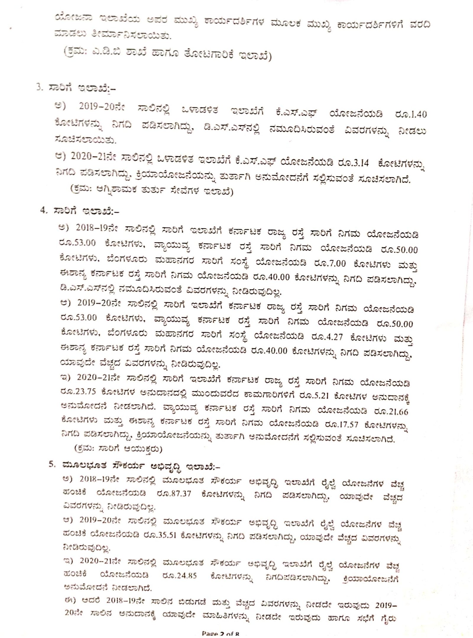 ಸಾರಿಗೆ ಇಲಾಖೆಗೆ 2019-20ನೇ ಸಾಲಿನಲ್ಲಿ ಕರ್ನಾಟಕ ರಾಜ್ಯ ರಸ್ತೆ ಸಾರಿಗೆ ನಿಗಮ ಯೋಜನೆಯಡಿ 53 ಕೋಟಿ, ವಾಯುವ್ಯ ಕರ್ನಾಟಕ ರಸ್ತೆ ಸಾರಿಗೆ ನಿಗಮ ಯೋಜನೆಯಡಿ 50 ಕೋಟಿ, ಬೆಂಗಳೂರು ಮಹಾನಗರ ಸಾರಿಗೆ (ಬಿಎಂಟಿಸಿ) ಯೋಜನೆಯಡಿ 4.27 ಕೋಟಿ, ಈಶಾನ್ಯ ಕರ್ನಾಟಕ ರಸ್ತೆ ಸಾರಿಗೆ ನಿಗಮ ಯೋಜನೆಯಡಿ 40 ಕೋಟಿಯನ್ನು ಖರ್ಚು ಮಾಡಿರುವ ಅಧಿಕಾರಿಗಳು ವೆಚ್ಚದ ವಿವರಗಳನ್ನು ನೀಡಿಲ್ಲ ಎಂಬುದು ನಡವಳಿಯಿಂದ ಗೊತ್ತಾಗಿದೆ.