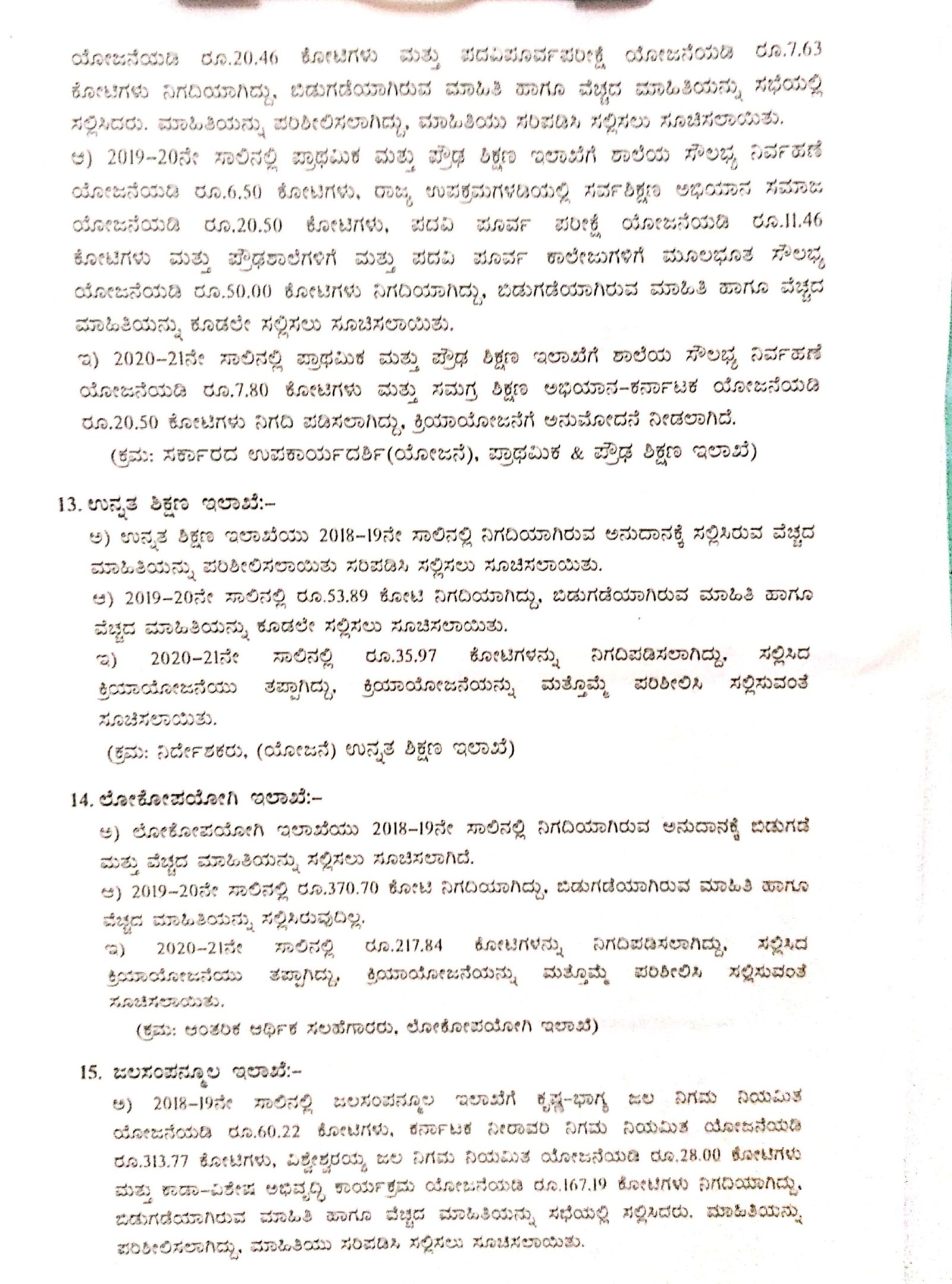 2019-20ನೇ ಸಾಲಿನಲ್ಲಿ 370.70 ಕೋಟಿ ರು. ಅನುದಾನವನ್ನು ಪಡೆದಿರುವ ಲೋಕೋಪಯೋಗಿ ಇಲಾಖೆಯು ವೆಚ್ಚದ ಮಾಹಿತಿ ನೀಡಿಲ್ಲ ಎಂಬುದು ನಡವಳಿಯಿಂದ ತಿಳಿದು ಬಂದಿದೆ. ಅಲ್ಲದೆ 2020-21ನೇ ಸಾಲಿನಲ್ಲಿಯೂ 217.84 ಕೋಟಿ ನಿಗದಿಪಡಿಸಿದ್ದರೂ ಈ ಸಂಬಂಧ ಅಧಿಕಾರಿಗಳು ಸಲ್ಲಿಸಿರುವ ಕ್ರಿಯಾ ಯೋಜನೆಯು ತಪ್ಪುಗಳಿಂದ ಕೂಡಿವೆ ಎಂಬುದು ಗೊತ್ತಾಗಿದೆ.