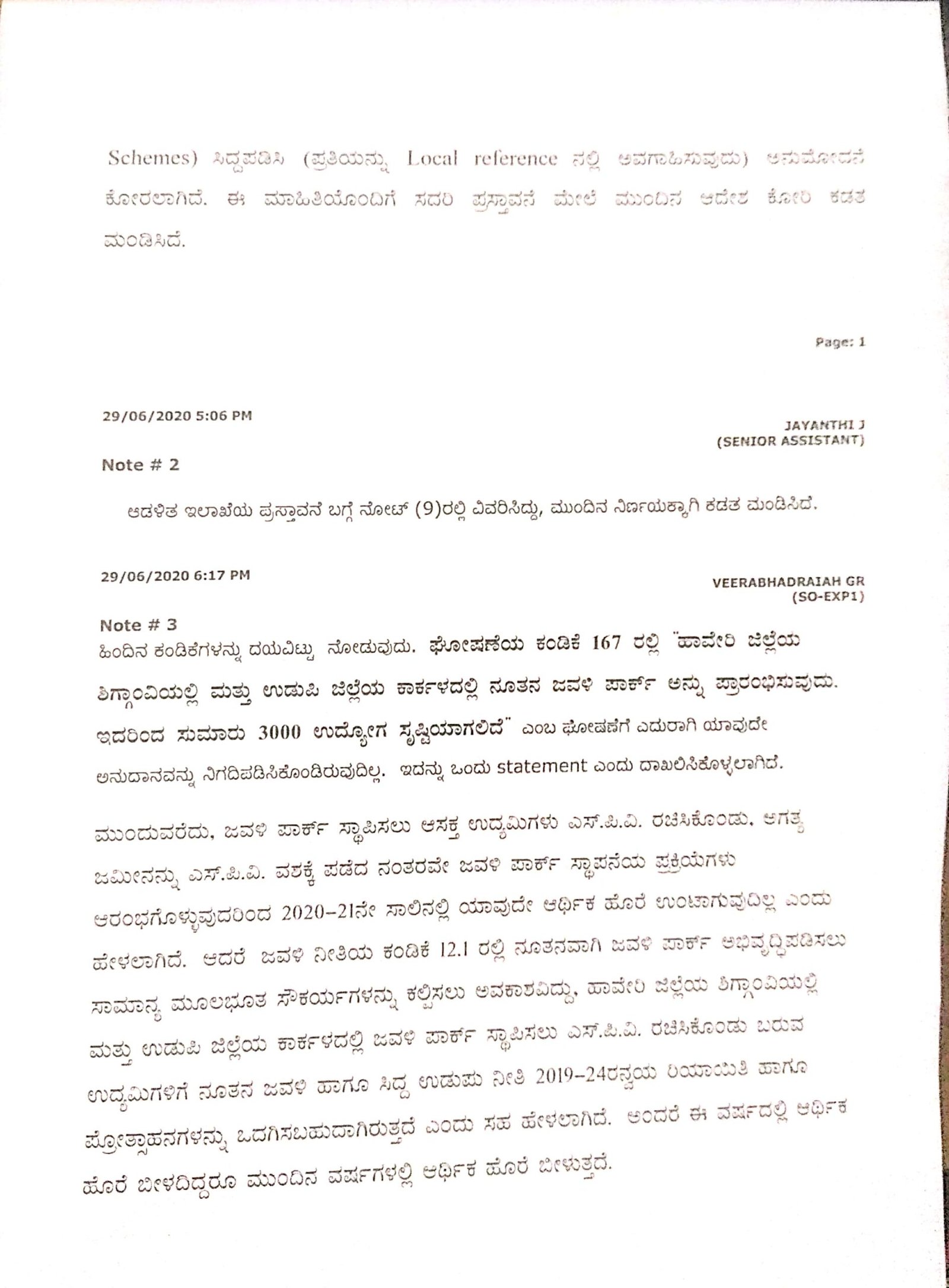 ‘ಹಾವೇರಿ ಜಿಲ್ಲೆಯ ಶಿಗ್ಗಾಂವಿ ಮತ್ತು ಉಡುಪಿ ಜಿಲ್ಲೆಯ ಕಾರ್ಕಳದಲ್ಲಿ ನೂತನ ಜವಳಿ ಪಾರ್ಕ್ ಆರಂಭಿಸುವುದು ಇದರಿಂದ ಸುಮಾರು 3,000 ಉದ್ಯೋಗ ಸೃಷ್ಟಿಯಾಗಲಿದೆ ಎಂಬ ಘೋಷಣೆಗೆ ಎದುರಾಗಿ ಯಾವುದೇ ಅನುದಾನವನ್ನು ನಿಗದಿಪಡಿಸಿಕೊಂಡಿರುವುದಿಲ್ಲ. ಇದನ್ನು ಒಂದು STATEMENT ಎಂದು ದಾಖಲಿಸಿಕೊಳ್ಳಲಾಗಿದೆ,’ ಎಂಬ ಮಾಹಿತಿ ಆರ್ಥಿಕ ಇಲಾಖೆಯ ಟಿಪ್ಪಣಿ ಹಾಳೆಯಿಂದ ತಿಳಿದು ಬಂದಿದೆ.