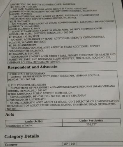 ಹೈಕೋರ್ಟ್ನಲ್ಲಿ ಸಲ್ಲಿಕೆಯಾಗಿರುವ ರಿಟ್ ಅರ್ಜಿಯಲ್ಲಿ ರಾಜ್ಯ ಸರ್ಕಾರದ ಮುಖ್ಯ ಕಾರ್ಯದರ್ಶಿ ಟಿ ಎಂ ವಿಜಯಭಾಸ್ಕರ್ ಅವರನ್ನು ಮೊದಲ ಪ್ರತಿವಾದಿಯನ್ನಾಗಿಸಿದ್ದರೆ, ಡಿಪಿಎಆರ್ನ ಪ್ರಧಾನ ಕಾರ್ಯದರ್ಶಿ ಹೇಮಲತಾ, ಕೆಪಿಎಸ್ಸಿ ಕಾರ್ಯದರ್ಶಿ ಮತ್ತು ವಿಶ್ವನಾಥ್ ಹಿರೇಮಠ್ ಅವರನ್ನೂ ಪ್ರತಿವಾದಿಯನ್ನಾಗಿಸಲಾಗಿದೆ. ರಿಟ್ ಅರ್ಜಿಯ ಪ್ರತಿ ‘ದಿ ಫೈಲ್’ಗೆ ಲಭ್ಯವಾಗಿದೆ.