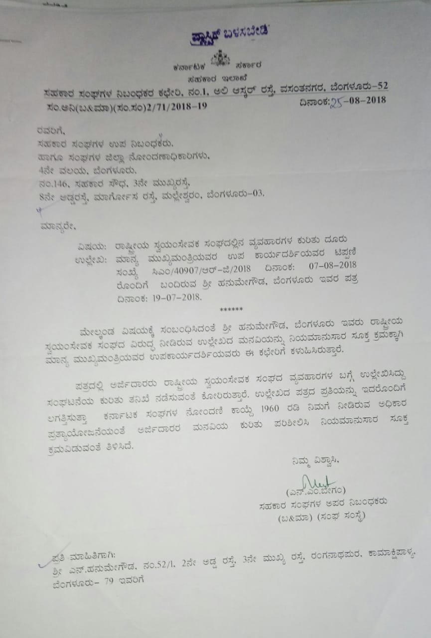 ರಾಷ್ಟ್ರೀಯ ಸ್ವಯಂ ಸೇವಕ ಸಂಘದಲ್ಲಿನ ವ್ಯವಹಾರಗಳ ಕುರಿತು ಸಾಮಾಜಿಕ ಕಾರ್ಯಕರ್ತ ಹನುಮೇಗೌಡ ಅವರು 2018ರಲ್ಲೇ ದೂರು ಸಲ್ಲಿಸಿದ್ದಾರೆ. ಅಲ್ಲದೆ ಸಂಘಟನೆ ಕುರಿತು ತನಿಖೆ ನಡೆಸಬೇಕು ಎಂದು ದೂರಿನಲ್ಲಿ ಒತ್ತಾಯಿಸಿದ್ದರು. ಈ ದೂರು ಆಧರಿಸಿ ಸಹಕಾರ ಸಂಘಗಳ ಹೆಚ್ಚುವರಿ ನಿಬಂಧಕ ಎನ್ ಎಂ ಬೇಗಂ ಅವರು ‘ಕರ್ನಾಟಕ ಸಂಘಗಳ ನೋಂದಣಿ ಕಾಯ್ದೆ 1960ರ ಅಡಿ ಅರ್ಜಿದಾರರ ಮನವಿ ಕುರಿತು ಪರಿಶೀಲಿಸಿ ನಿಯಮಾನುಸಾರವಾಗಿ ಕ್ರಮವಿಡಬೇಕು,’ ಎಂದು 2018ರ ಆಗಸ್ಟ್ 25ರಂದು ಸಹಕಾರ ಸಂಘಗಳ ಉಪ ನಿಬಂಧಕರಿಗೆ ಪತ್ರ ಮುಖೇನ ಸೂಚಿಸಿದ್ದರು.