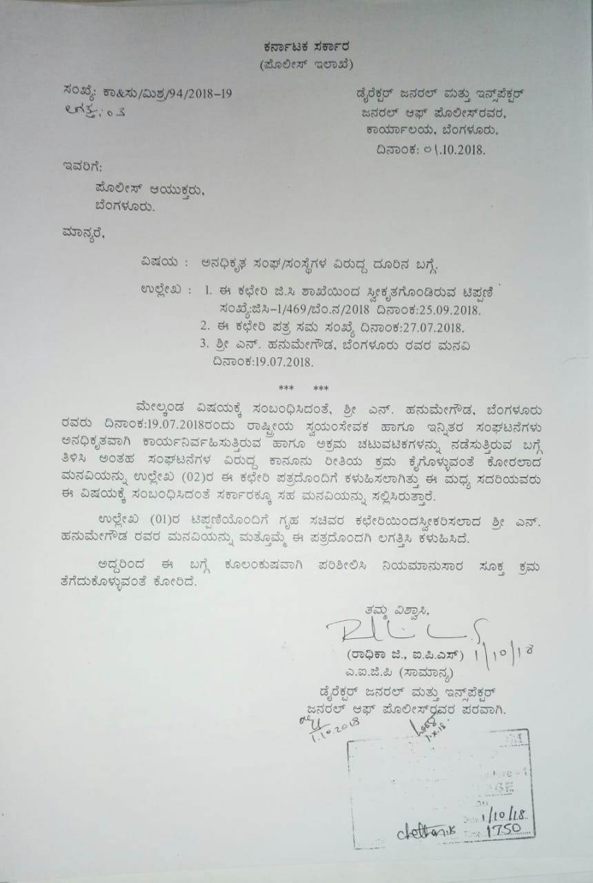 ರಾಷ್ಟ್ರೀಯ ಸ್ವಯಂ ಸೇವಕ ಸಂಘ ಹಾಗೂ ಇನ್ನಿತರೆ ಸಂಘಟನೆಗಳು ಅನಧಿಕೃತವಾಗಿ ಕಾರ್ಯನಿರ್ವಹಿಸುತ್ತಿರುವ ಹಾಗೂ ಅಕ್ರಮ ಚಟುವಟಿಕೆಗಳನ್ನು ನಡೆಸುತ್ತಿರುವ ಬಗ್ಗೆ ಕ್ರಮ ಕೈಗೊಳ್ಳಬೇಕು ಎಂದು ಹನುಮೇಗೌಡ ಅವರು ಪೊಲೀಸ್ ಮಹಾನಿರ್ದೇಶಕರಿಗೆ 2018ರ ಜುಲೈ 19ರಂದು ದೂರು ಸಲ್ಲಿಸಿದ್ದರು. ಈ ದೂರು ಆಧರಿಸಿ ಡಿಜಿಪಿ ಕಚೇರಿಯ ಎಐಜಿಪಿ ರಾಧಿಕಾ ಜಿ ಅವರು ನಿಯಮಾನುಸಾರವಾಗಿ ಪರಿಶೀಲಿಸಿ ಕ್ರಮ ಕೈಗೊಳ್ಳಬೇಕು ಎಂದು ಬೆಂಗಳೂರು ನಗರದ ಪೊಲೀಸ್ ಆಯುಕ್ತರಿಗೆ 2018ರ ಅಕ್ಟೋಬರ್ 1ರಂದು ಪತ್ರ ಬರೆದಿದ್ದರು. ಇದರ ಪ್ರತಿ ‘ದಿ ಫೈಲ್’ಗೆ ಲಭ್ಯವಾಗಿದೆ.