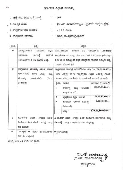 ಕರ್ನಾಟಕ ವಿಧಾನಪರಿಷತ್ ಸದಸ್ಯ ಎಂ ನಾರಾಯಣಸ್ವಾಮಿ ಅವರು ಕೇಳಿದ್ದ ಚುಕ್ಕೆ ಗುರುತಿಲ್ಲದ ಪ್ರಶ್ನೆಗೆ ‘ಕೊರೊನಾ ನಿರ್ವಹಣೆಗೆ ರಾಜ್ಯ ಸರ್ಕಾರಕ್ಕೆ ಪಿ ಎಂ ಕೇರ್ಸ್ ಫಂಡ್ನಿಂದ ಯಾವುದೇ ಅನುದಾನ ಬಂದಿರುವುದಿಲ್ಲ,’ ಎಂದು 2020ರ ಸೆ. 24ರಂದು ಮುಖ್ಯಮಂತ್ರಿ ಯಡಿಯೂರಪ್ಪ ಅವರು ಉತ್ತರಿಸಿದ್ದಾರೆ.