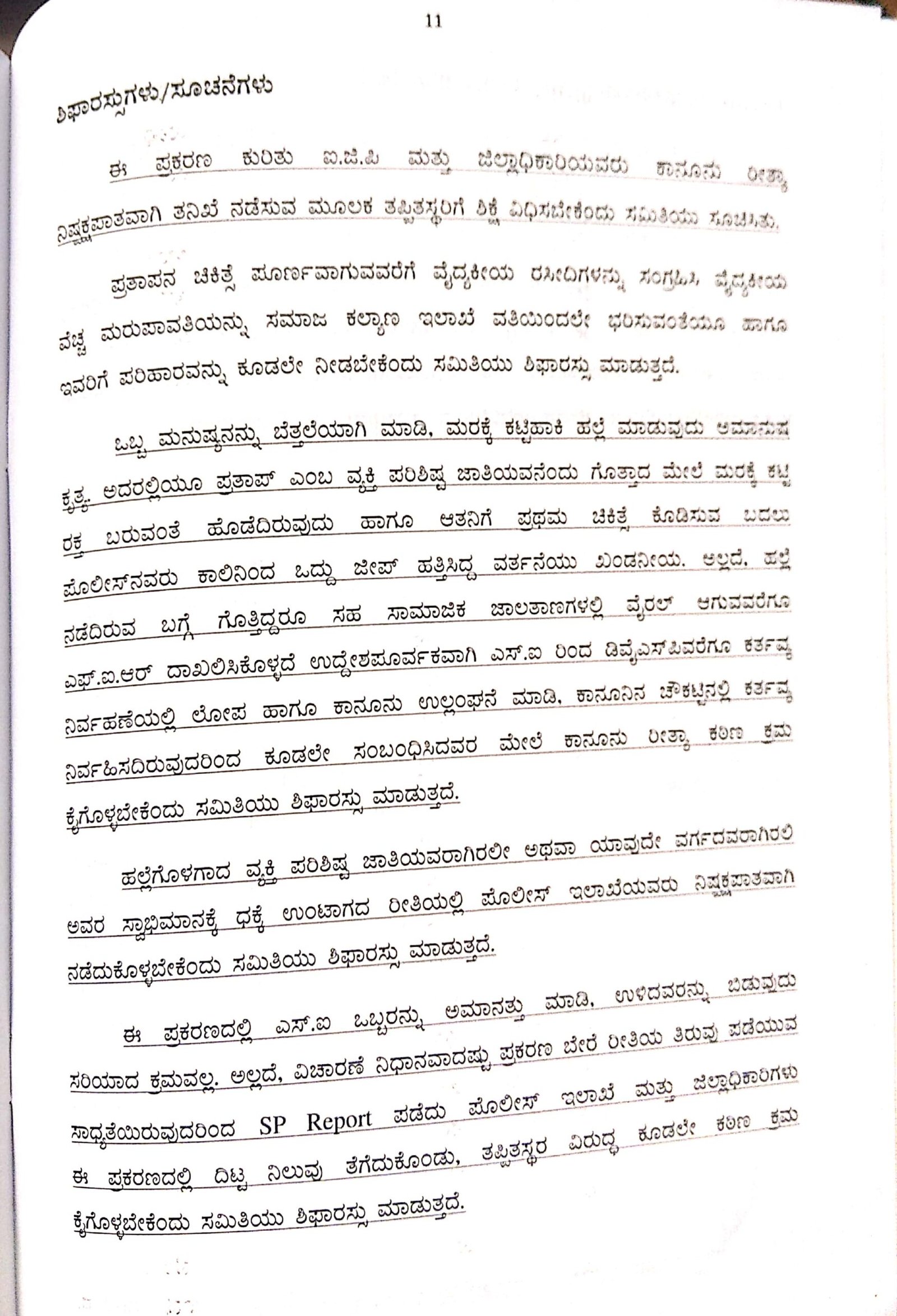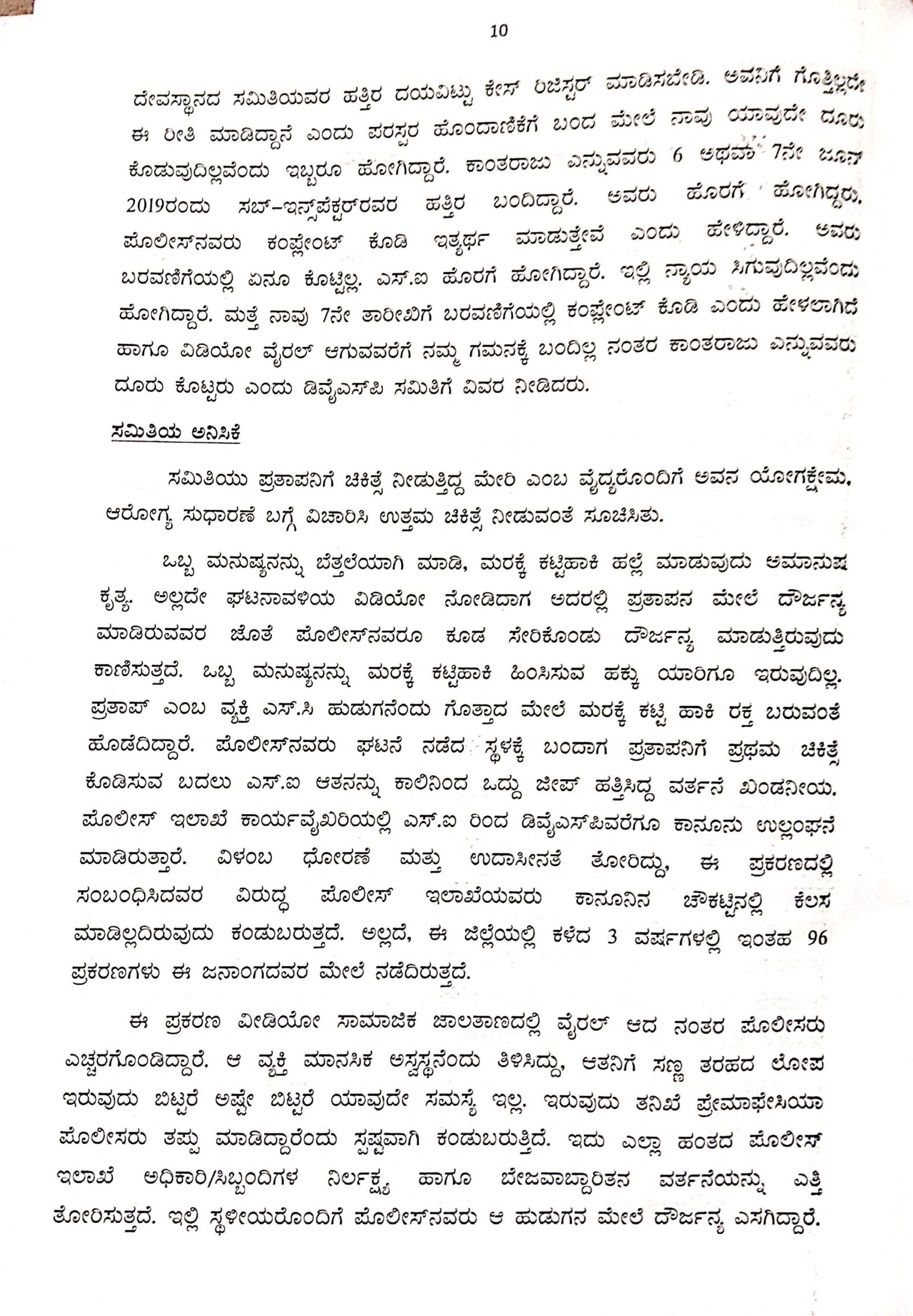 ‘ಒಬ್ಬ ಮನುಷ್ಯನನ್ನು ಬೆತ್ತಲೆಗೊಳಿಸಿ ಮರಕ್ಕೆ ಕಟ್ಟಿಹಾಕಿ ಹಲ್ಲೆ ಮಾಡುವುದು ಅಮಾನುಷ ಕೃತ್ಯ. ಪ್ರತಾಪನ ಮೇಲೆ ದೌರ್ಜನ್ಯ ಮಾಡಿರುವವರ ಜತೆ ಪೊಲೀಸಿನವರೂ ಸೇರಿಕೊಂಡು ದೌರ್ಜನ್ಯ ಮಾಡಿರುವುದು ಕಾಣಿಸುತ್ತದೆ. ಪ್ರತಾಪ್ ದಲಿತನೆಂದು ಗೊತ್ತಾದ ಮೇಲೆ ಮರಕ್ಕೆ ಕಟ್ಟಿ ಹಾಕಿ ರಕ್ತ ಬರುವಂತೆ ಹೊಡೆದಿದ್ದಾರೆ. ಆತನನ್ನು ಕಾಲಿನಿಂದ ಒದ್ದು ಜೀಪ್ ಹತ್ತಿಸಿದ್ದ ವರ್ತನೆ ಖಂಡನೀಯ,’ ಎಂದು ಸಮಿತಿ ಅಭಿಪ್ರಾಯಿಸಿದೆ.