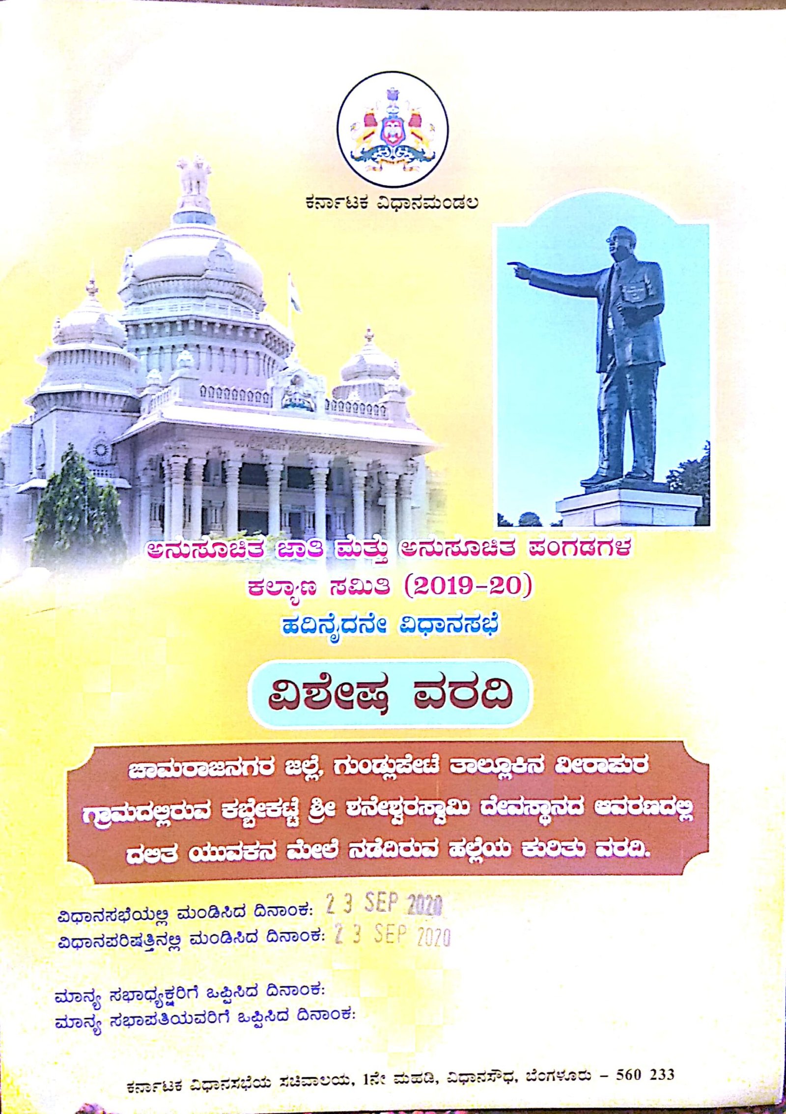 ಬೆಂಗಳೂರು; ಗುಂಡ್ಲುಪೇಟೆ ತಾಲೂಕಿನಲ್ಲಿ ವೀರಾಪುರ ಗ್ರಾಮದ ಕಬ್ಬೇಕಟ್ಟೆ ಶನೇಶ್ವರಸ್ವಾಮಿ ದೇವಸ್ಥಾನ ಆವರಣದಲ್ಲಿ ದಲಿತ ಯುವಕನ ಮೇಲೆ ಹಲ್ಲೆ ನಡೆದಿದ್ದರೂ ಸಾಮಾಜಿಕ ಜಾಲತಾಣಗಳಲ್ಲಿ ವೈರಲ್ ಆಗುವವರೆಗೂ ಪೊಲೀಸರು ಎಫ್ಐಆರ್ ದಾಖಲಿಸಿಕೊಳ್ಳದೇ ಕರ್ತವ್ಯ ಲೋಪ ಎಸಗಿದ್ದಾರೆ ಎಂದು ವಿಧಾನಮಂಡಲದ ಅನುಸೂಚಿತ ಜಾತಿ ಮತ್ತು ಪಂಗಡಗಳ ಕಲ್ಯಾಣ ಸಮಿತಿ ಅಭಿಪ್ರಾಯಪಟ್ಟಿದೆ.
