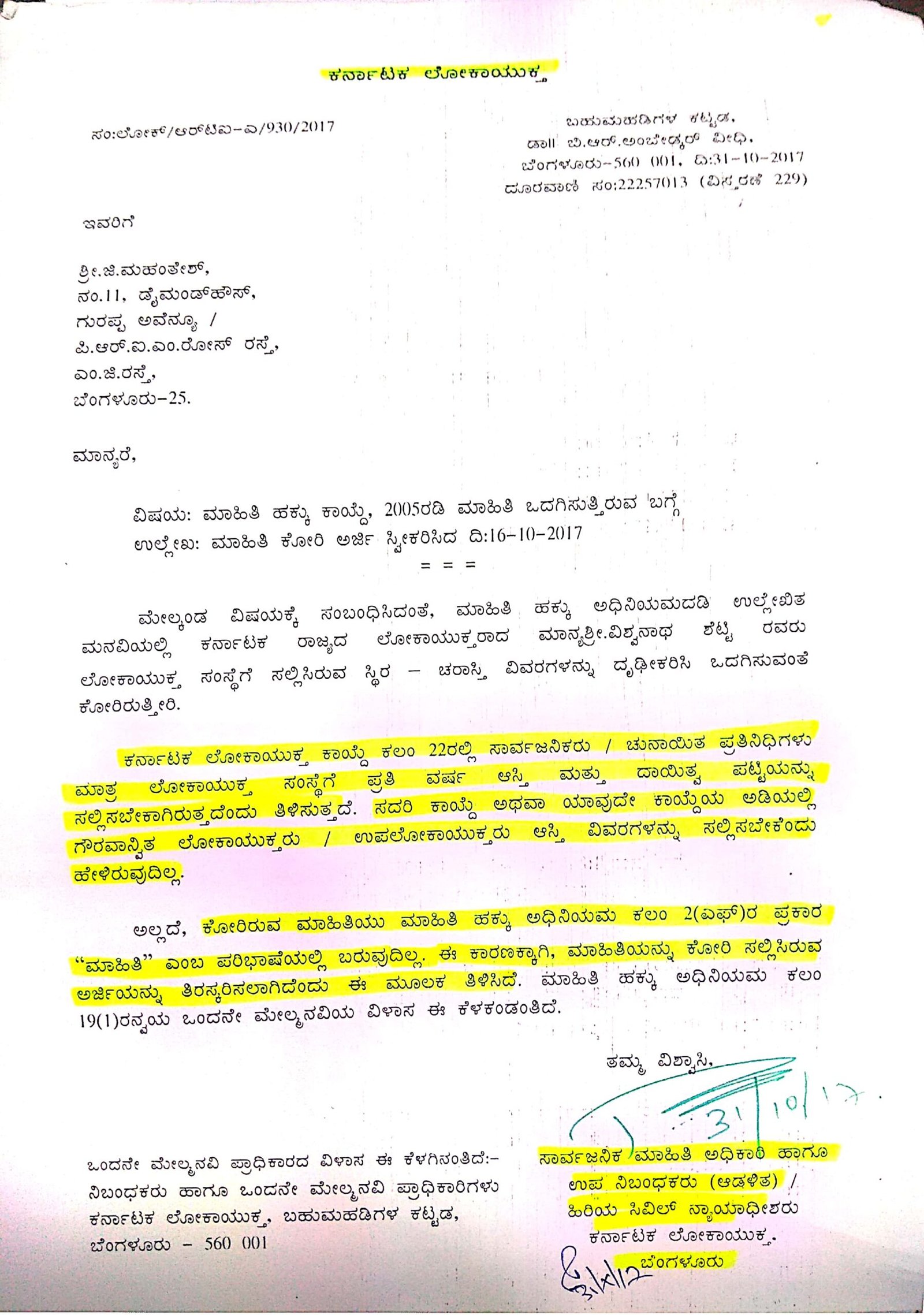 ಲೋಕಾಯುಕ್ತರು ಆಸ್ತಿ ವಿವರ ಕೋರಿ ಮಾಹಿತಿ ಹಕ್ಕು ಅಡಿ ಸಲ್ಲಿಸಲಾಗಿದ್ದ ಅರ್ಜಿಗೆ ಉತ್ತರಿಸಿರುವ ಲೋಕಾಯುಕ್ತ ಸಂಸ್ಥೆಯ ಸಾರ್ವಜನಿಕ ಮಾಹಿತಿ ಹಕ್ಕು ಅಧಿಕಾರಿಯೂ ಆಗಿರುವ ಉಪ ನಿಬಂಧಕರು ‘ಕರ್ನಾಟಕ ಲೋಕಾಯುಕ್ತ ಕಾಯ್ದೆ ಕಲಂ 22ರಲ್ಲಿ ಸಾರ್ವಜನಿಕರು/ಚುನಾಯಿತ ಜನಪ್ರತಿನಿಧಿಗಳು ಮಾತ್ರ ಲೋಕಾಯುಕ್ತ ಸಂಸ್ಥೆಗೆ ಪ್ರತಿ ವರ್ಷ ಆಸ್ತಿ ಮತ್ತು ದಾಯಿತ್ವ ಪಟ್ಟಿಯನ್ನು ಸಲ್ಲಿಸಬೇಕಾಗಿರುತ್ತದೆ ಎಂದು ತಿಳಿಸುತ್ತದೆ. ಸದರಿ ಕಾಯ್ದೆ ಅಥವಾ ಕಾಯ್ದೆಯ ಅಡಿಯಲ್ಲಿ ಗೌರವಾನ್ವಿತ ಲೋಕಾಯುಕ್ತರು/ಉಪ ಲೋಕಾಯುಕ್ತರು ಆಸ್ತಿ ವಿವರಗಳನ್ನು ಸಲ್ಲಿಸಬೇಕೆಂದು ಹೇಳಿರುವುದಿಲ್ಲ,’ ಎಂದು ಸಮಜಾಯಿಷಿ ನೀಡಿದ್ದಾರೆ.