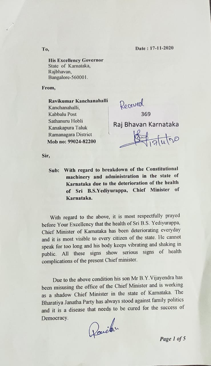 ಯಡಿಯೂರಪ್ಪ ಅವರ ಅನಾರೋಗ್ಯವನ್ನು ಅವರ ಪುತ್ರ ಬಿ ವೈ ವಿಜಯೇಂದ್ರ ಅವರು ಲಾಭ ಮಾಡಿಕೊಳ್ಳುತ್ತಿದ್ದಾರೆ ಎಂದು ರವಿಕುಮಾರ್ ಅವರು ರಾಜ್ಯಪಾಲರಿಗೆ ಸಲ್ಲಿಸಿರುವ ಲಿಖಿತ ಮನವಿಯಲ್ಲಿ ವಿವರಿಸಿದ್ದಾರೆ. ಇದರ ಪ್ರತಿ ‘ದಿ ಫೈಲ್’ಗೆ ಲಭ್ಯವಾಗಿದೆ.
