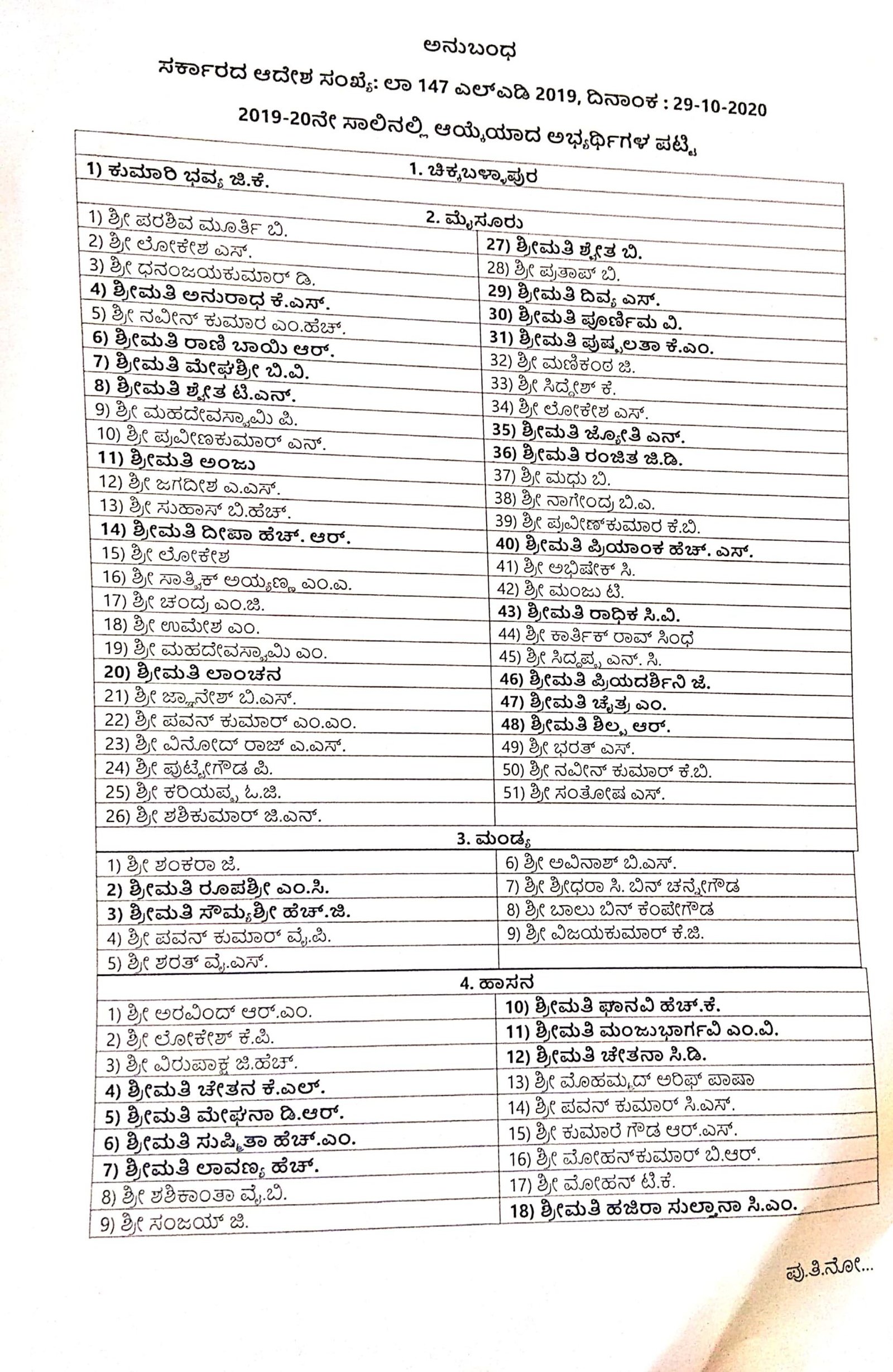 ಚಿಕ್ಕಬಳ್ಳಾಪುರ ಜಿಲ್ಲೆಯಲ್ಲಿ, ಆಯ್ಕೆ ಸಮಿತಿಯು ಕೇವಲ ಒಬ್ಬ ಫಲಾನುಭವಿಯನ್ನು ಮಾತ್ರ ಆಯ್ಕೆ ಮಾಡಿದೆ. ಮೈಸೂರು ಜಿಲ್ಲೆಯಲ್ಲಿ 51, ಮಂಡ್ಯ 9, ಹಾಸನ 18, ಕೊಪ್ಪಳ 18, ದಾವಣಗೆರೆ 2, ದಕ್ಷಿಣ ಕನ್ನಡ 23, ಬೆಳಗಾವಿ 79, ಧಾರವಾಡ 28, ಗದಗ್ 8, ಹಾವೇರಿ 23, ಬಾಗಲಕೋಟೆ 34, ಉತ್ತರ ಕನ್ನಡ 2, ರಾಯಚೂರು 17 ಮತ್ತು ಉಡುಪಿಯಲ್ಲಿ 4 ಫಲಾನುಭವಿಗಳನ್ನು ಆಯಾ ಜಿಲ್ಲಾ ಸಮಿತಿಗಳು ಆಯ್ಕೆ ಮಾಡಿರುವುದು ಪಟ್ಟಿಯಿಂದ ತಿಳಿದು ಬಂದಿದೆ.