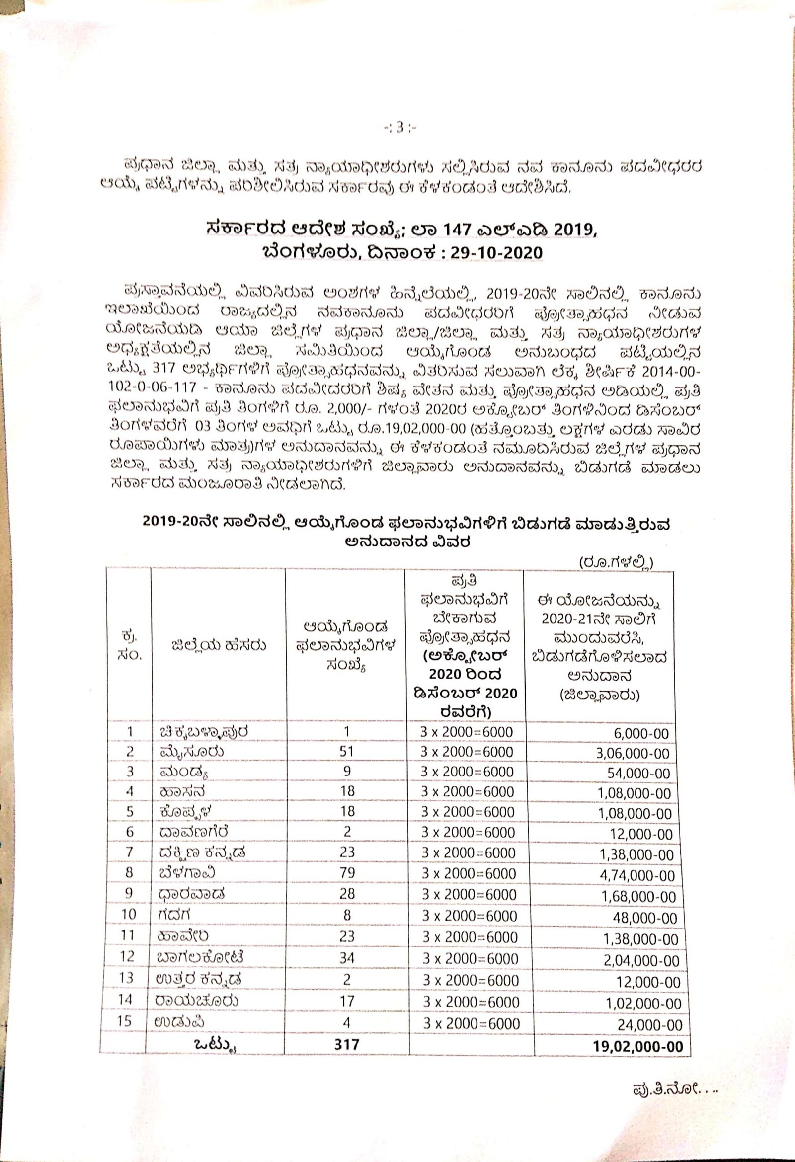 ಜಿಲ್ಲಾ ಹಂತದಲ್ಲಿಯೇ ಆಯಾ ಜಿಲ್ಲೆಗಳ ಪ್ರಧಾನ ಜಿಲ್ಲಾ ಮತ್ತು ಸತ್ರ ನ್ಯಾಯಾಧೀಶರ ಅಧ್ಯಕ್ಷತೆಯಲ್ಲಿರುವ ಜಿಲ್ಲಾ ಆಯ್ಕೆ ಸಮಿತಿಯು ಒಟ್ಟು 317 ಫಲಾನುಭವಿಗಳನ್ನು ಆಯ್ಕೆ ಮಾಡಿದೆ. ಆಯ್ಕೆಯಾದ ಫಲಾನುಭವಿಗಳಿಗೆ ತಲಾ 6,000 ರು.ಗಳಂತೆ ಒಟ್ಟು 15 ಜಿಲ್ಲೆಗಳಿಗೆ 19,02,000.00 ಗಳ ಪ್ರೋತ್ಸಾಹ ಧನವನ್ನು ಮಂಜೂರು ಮಾಡಿ 2020ರ ಅಕ್ಟೋಬರ್ 29ರಂದು ಸರ್ಕಾರ ಆದೇಶ ಹೊರಡಿಸಿದೆ. 2020ರ ಅಕ್ಟೋಬರ್ನಿಂದ ಡಿಸೆಂಬರ್ವರೆಗೆ ಪ್ರೋತ್ಸಾಹ ಧನವನ್ನು ಬಿಡುಗಡೆ ಮಾಡಿ ಆದೇಶಿಸಿದೆ. ಆಯ್ಕೆಯಾದ ಫಲಾನುಭವಿಗಳ ಪಟ್ಟಿ ಮತ್ತು ಸರ್ಕಾರ ಹೊರಡಿಸಿರುವ ಆದೇಶದ ಪ್ರತಿ ‘ದಿ ಫೈಲ್’ಗೆ ಲಭ್ಯವಾಗಿದೆ.