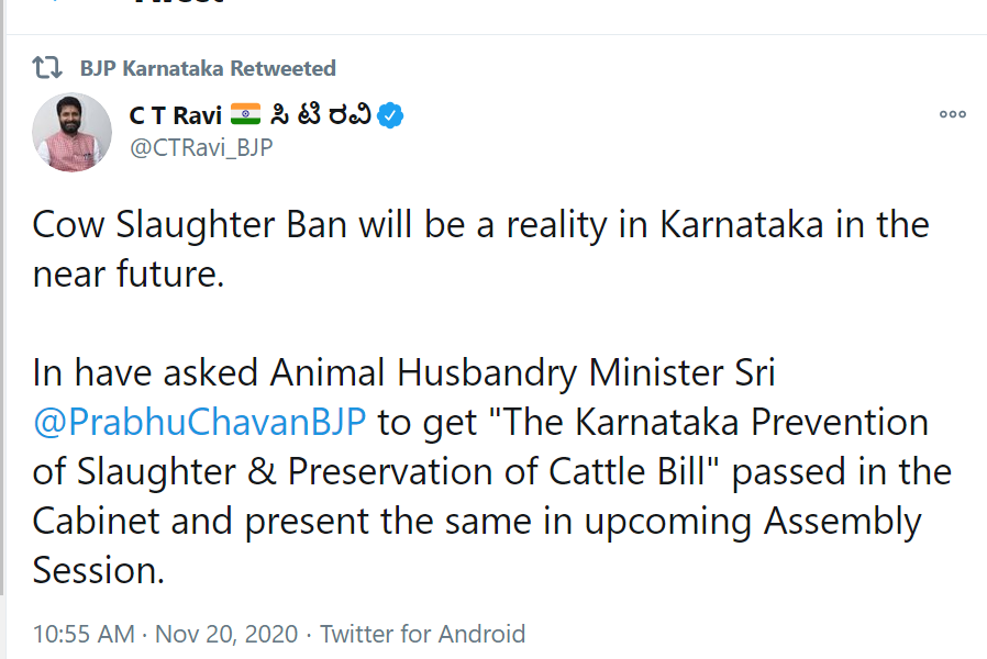 ‘ಗೋ ಹತ್ಯೆ ನಿಷೇಧಿಸಲು ಮಾನ್ಯ ಮುಖ್ಯಮಂತ್ರಿ ಬಿ ಎಸ್ ಯಡಿಯೂರಪ್ಪ ನೇತೃತ್ವದ ಬಿಜೆಪಿ ಸರ್ಕಾರ ಬದ್ಧವಾಗಿದೆ. ರಾಜ್ಯಾಧ್ಯಕ್ಷ ನಳೀನ್ ಕಟೀಲ್ ಅವರು ಈಗಾಗಲೇ ಸರ್ಕಾರಕ್ಕೆ ಸಲಹೆ ನೀಡಿದ್ದಾರೆ. ಇದರ ಬಗ್ಗೆ ಪಕ್ಷದ ರಾಷ್ಟ್ರೀಯ ಪ್ರಧಾನ ಕಾರ್ಯದರ್ಶಿ ಸಿ ಟಿ ರವಿ ಅವರು ಕೂಡ ಸಚಿವ ಪ್ರಭು ಚವ್ಹಾಣ್ ಅವರೊಂದಿಗೆ ಚರ್ಚಿಸಿದ್ದಾರೆ,’ ಎಂದು ರಾಜ್ಯ ಬಿಜೆಪಿ ಘಟಕವು ಟ್ವೀಟ್ ಮಾಡಿದೆ.