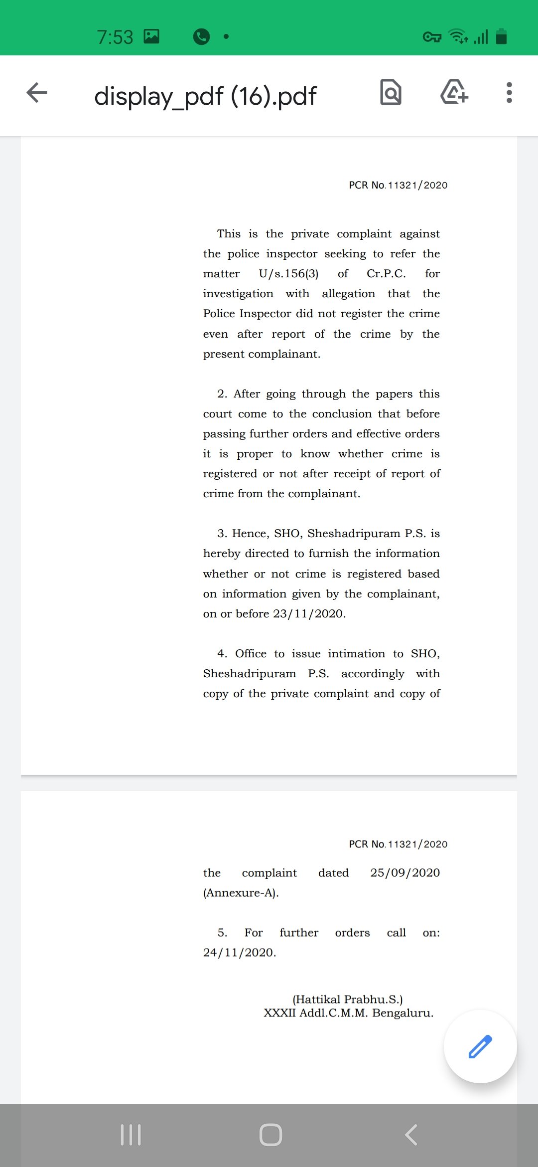 ಪ್ರಕರಣದ ಕುರಿತು ಜನಾಧಿಕಾರ ಸಂಘರ್ಷ ಪರಿಷತ್ ದಾಖಲಿಸಿದ್ದ ಖಾಸಗಿ ದೂರು ಆಧರಿಸಿ ಅಕ್ಟೋಬರ್ 20ರಂದು ಪ್ರಕರಣ ಕುರಿತು ವಿಚಾರಣೆ ನಡೆದಿತ್ತು. ಈ ಸಂಬಂಧ ತೀರ್ಪನ್ನು ಕಾಯ್ದಿರಿಸಿದ್ದ ಮ್ಯಾಜಿಸ್ಟ್ರೇಟ್ ನವೆಂಬರ್ 21ರಂದು ಮಧ್ಯಂತರ ಆದೇಶವನ್ನು ಪ್ರಕಟಿಸಿದ್ದಾರೆ. ಈ ಆದೇಶದ ಪ್ರತಿ’ದಿ ಫೈಲ್’ಗೆ ಲಭ್ಯವಾಗಿದೆ.