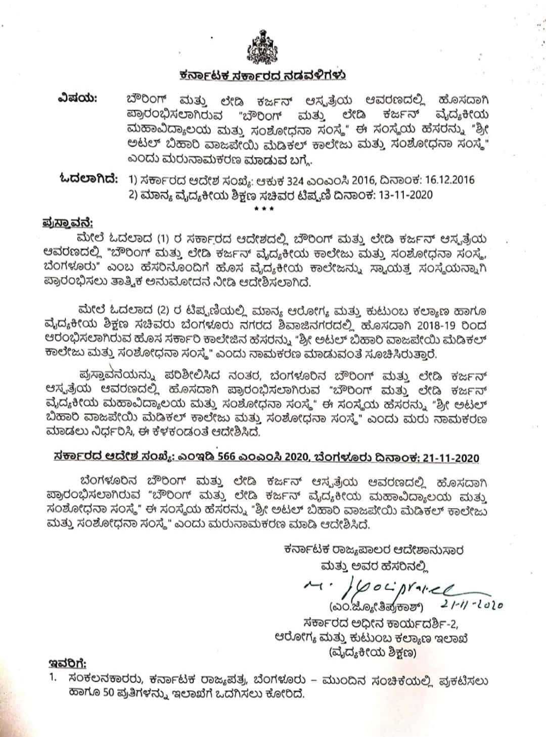 ಸ್ವಾತಂತ್ರ್ಯ ಪೂರ್ವದ ದಿನಗಳಲ್ಲಿ ಬೆಂಗಳೂರು ನಗರದಲ್ಲಿದ್ದ ಏಕಮಾತ್ರ ನಾಗರಿಕ ವೈದ್ಯಕೀಯ ಸಂಸ್ಥೆ ಎಂಬ ಹೆಗ್ಗಳಿಕೆ ಹೊಂದಿರುವ ಬೌರಿಂಗ್‌ ಲೇಡಿ ಕರ್ಜನ್‌ ಆಸ್ಪತ್ರೆಯ ಆವರಣದಲ್ಲಿ ಉದ್ಧೇಶಿತ ವೈದ್ಯಕೀಯ ಕಾಲೇಜಿನ ಹೆಸರನ್ನು ಬದಲಿಸಿ ಅಟಲ್‌ ಬಿಹಾರಿ ವೈದ್ಯಕೀಯ ಕಾಲೇಜು ಮತ್ತು ಸಂಶೋಧನಾ ಸಂಸ್ಥೆ ಎಂದು ಮರು ನಾಮಕರಣ ಮಾಡಿ ಆದೇಶ ಹೊರಡಿಸಿದೆ. ಆರೋಗ್ಯ ಮತ್ತು ವೈದ್ಯಕೀಯ ಶಿಕ್ಷಣ ಸಚಿವ ಡಾ ಕೆ ಸುಧಾಕರ್‌ ಅವರು ಆದೇಶದ ಪ್ರತಿಯನ್ನು ಟ್ವೀಟ್‌ ಮಾಡಿದ್ದಾರೆ.