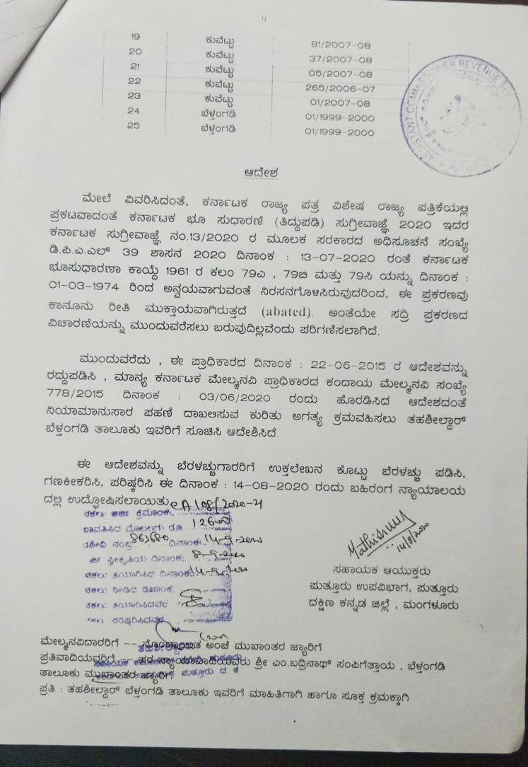 ಕರ್ನಾಟಕ ಭೂ ಸುಧಾರಣೆ (ತಿದ್ದುಪಡಿ) ಸುಗ್ರಿವಾಜ್ಞೆಯು 2020ರ ಜುಲೈ 13ರಂತೆ ಕರ್ನಾಟಕ ಭೂ ಸುಧಾರಣೆ ಕಾಯ್ದೆಯ 1961ರ ಕಲಂ 79 ಎ, 79 ಬಿ ಮತ್ತು 79 ಸಿ ಯನ್ನು 1974ರ ಮಾರ್ಚ್ 1ರಿಂದ ಅನ್ವಯವಾಗುವಂತೆ ನಿರಸನಗೊಂಡಿರುವುದನ್ನು ಮುಂದಿಟ್ಟುಕೊಂಡು 5 ವರ್ಷದ ಹಿಂದೆ ಅಸಿಂಧು ಎಂದು ಹೊರಡಿಸಿದ್ದ ಆದೇಶವನ್ನು ಪುತ್ತೂರು ಉಪ ವಿಭಾಗದ ಸಹಾಯಕ ಆಯುಕ್ತ ಡಾ ಯತೀಶ್ ಉಲ್ಲಾಳ್ ಅವರು ರದ್ದುಗೊಳಿಸಿದ್ದಾರೆ. 2020ರ ಆಗಸ್ಟ್ 14ರಂದು ತೆರೆದ ನ್ಯಾಯಾಲಯದಲ್ಲಿ ಈ ಆದೇಶವನ್ನು ಘೋಷಿಸಿದ್ದಾರೆ. ಇದರ ಪ್ರತಿ ‘ದಿ ಫೈಲ್’ಗೆ ಲಭ್ಯವಾಗಿದೆ.