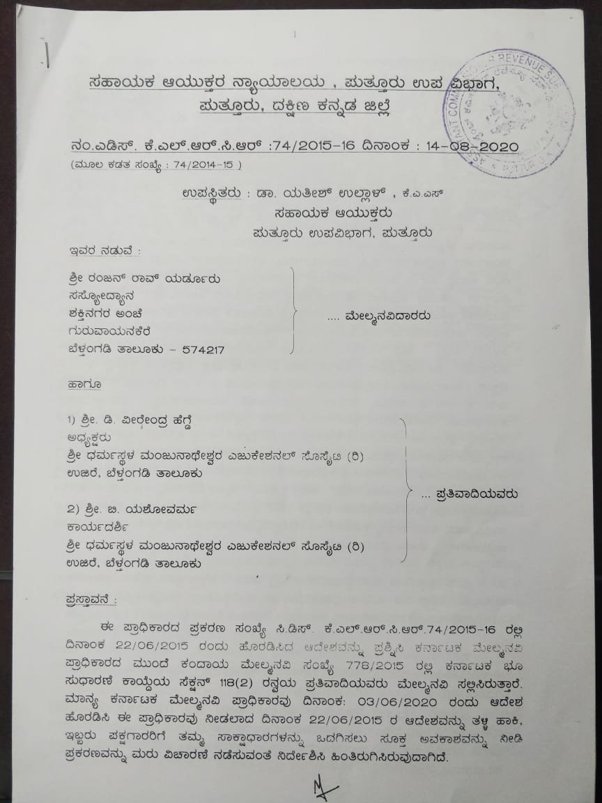 ಧರ್ಮಸ್ಥಳದ ಮಂಜುನಾಥೇಶ್ವರ ಎಜುಕೇಷನ್ ಸೊಸೈಟಿ, ಕರ್ನಾಟಕ ಭೂ ಸುಧಾರಣೆ ಕಾಯ್ದೆ ಉಲ್ಲಂಘಿಸಿ ಕೃಷಿ ಜಮೀನು ಹೊಂದಿದೆ ಎಂದು ಗುರುವಾಯನಕೆರೆಯ ರಂಜನ್ರಾವ್ ಎಂಬುವರು ಪುತ್ತೂರು ವಿಭಾಗದ ಸಹಾಯಕ ಆಯುಕ್ತರಿಗೆ ದೂರು ಸಲ್ಲಿಸಿದ್ದರು. ಮೇ 18, 2015ರಿಂದ ಜೂನ್ 6, 2015ರವರೆಗೆ ಪ್ರಕರಣದ ವಿಚಾರಣೆ ನಡೆದಿತ್ತು.