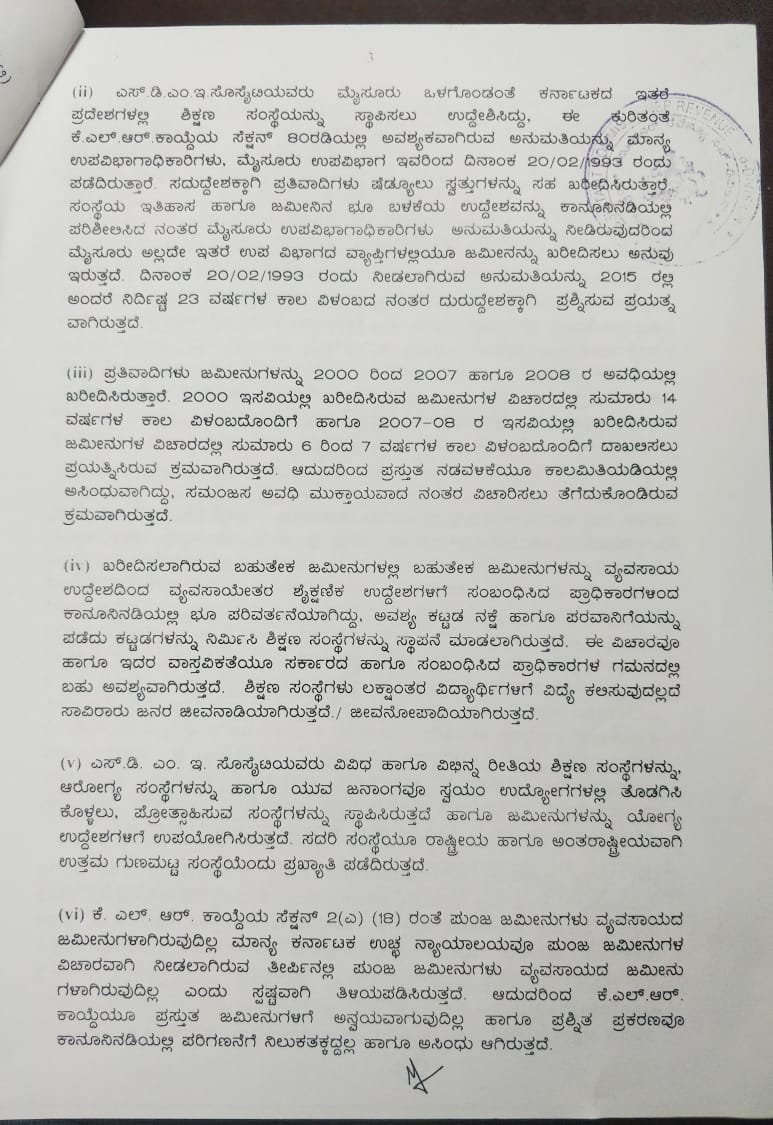 ಡಿ.ವೀರೇಂದ್ರ ಹೆಗ್ಡೆ ಅಧ್ಯಕ್ಷರಾಗಿರುವ ಧರ್ಮಸ್ಥಳ ಮಂಜುನಾಥೇಶ್ವರ ಎಜುಕೇಷನ್ ಸೊಸೈಟಿಗೆ ಕೃಷಿ ಜಮೀನನ್ನು ಉಪ ನೋಂದಣಾಧಿಕಾರಿಗಳು ನೋಂದಾಯಿಸುವ ಮೊದಲು ಕಾಯಿದೆ ಮತ್ತು ನಿಯಮಗಳನ್ನು ಪಾಲಿಸದೆ ಉಲ್ಲಂಘಿಸಿರುವುದು ಸ್ಪಷ್ಟವಾಗಿದೆ. ನೋಂದಣಿ ಕ್ರಯಪತ್ರದಂತೆ ಮಂಜುನಾಥೇಶ್ವರ ಎಜುಕೇಷನ್ ಸೊಸೈಟಿಗೆ ಮ್ಯುಟೇಷನ್ ಆದೇಶವನ್ನು ಹೊರಡಿಸುವ ಮುನ್ನ ಬೆಳ್ತಂಗಡಿ ತಾಲೂಕಿನ ತಹಶೀಲ್ದಾರ್ ಕರ್ನಾಟಕ ಭೂ ಸುಧಾರಣೆ ಕಾಯಿದೆ 1961/74 ಕಲಂ 79(ಬಿ)ಯಲ್ಲಿನ ಅಂಶಗಳನ್ನ ಮನವರಿಕೆ ಮಾಡಿಕೊಂಡಿಲ್ಲ. ಮೈಸೂರಿನ ಉಪ ವಿಭಾಗಾಧಿಕಾರಿಗಳು ಫೆಬ್ರುವರಿ 20, 1993ರಲ್ಲಿ ಬರೆದಿದ್ದ ಪತ್ರಕ್ಕೆ ಸಂಬಂಧಪಟ್ಟವರಿಂದ ಯಾವುದೇ ಸ್ಪಷ್ಟೀಕರಣ ಪಡೆಯದೇ ನಿಯಮ ಉಲ್ಲಂಘಿಸಿ ಖಾತೆ ಮಾಡಿಕೊಟ್ಟಿರುವುದು ಸ್ಪಷ್ಟವಾಗಿದೆ ಎಂದು ಸಹಾಯಕ ಆಯುಕ್ತರು ಆದೇಶದಲ್ಲಿ ವಿವರಿಸಿದ್ದರು.