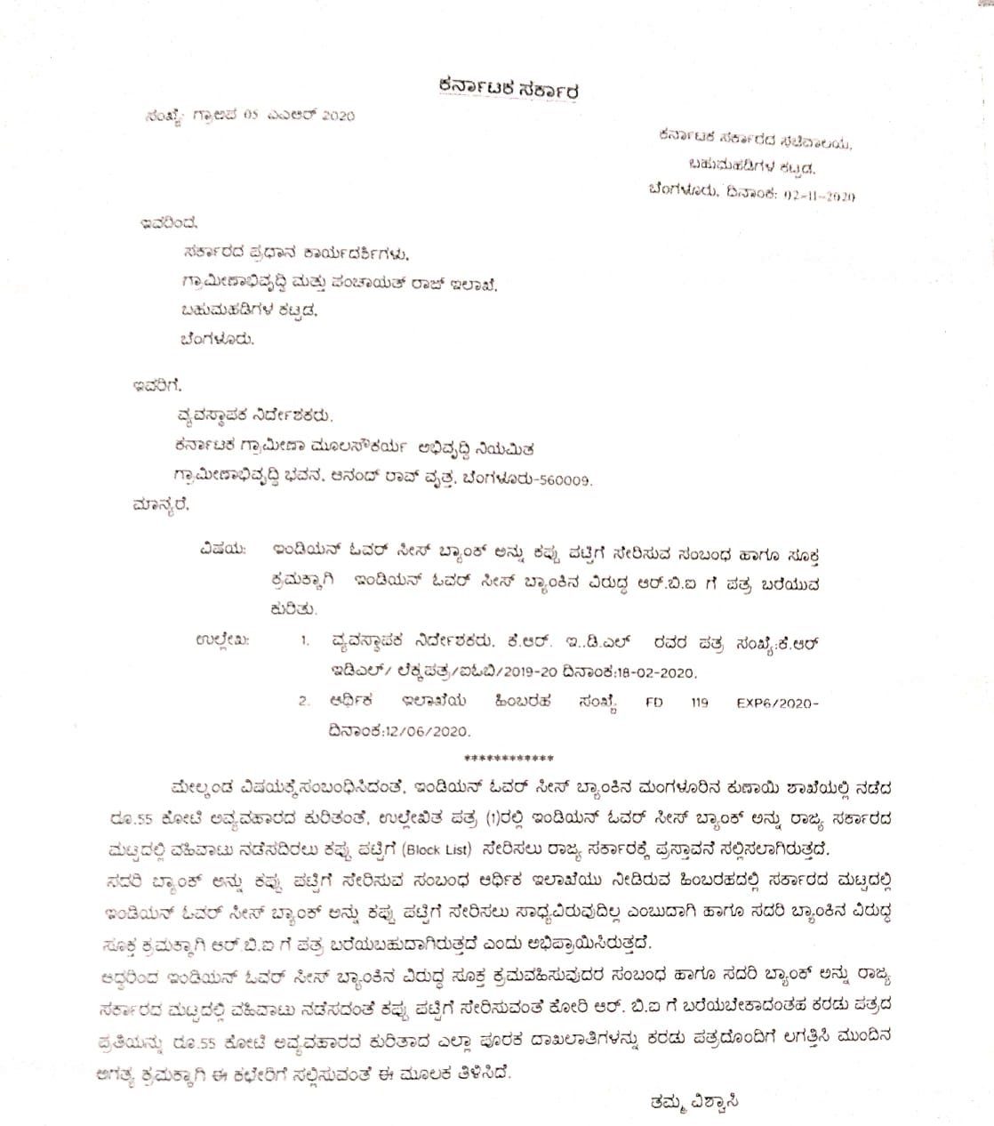 ‘ಇಂಡಿಯನ್‌ ಓವರ್‌ಸೀಸ್‌ ಬ್ಯಾಂಕ್‌ನ ವಿರುದ್ಧ ಸೂಕ್ತ ಕ್ರಮವಹಿಸುವುದರ ಸಂಬಂಧ ಹಾಗೂ ಬ್ಯಾಂಕ್‌ನ್ನು ರಾಜ್ಯ ಸರ್ಕಾರದ ಮಟ್ಟದಲ್ಲಿ ವಹಿವಾಟು ನಡೆಸದಂತೆ ಕಪ್ಪು ಪಟ್ಟಿಗೆ ಸೇರಿಸಲು ಕ್ರಮ ವಹಿಸುವ ಸಂಬಂಧ ಆರ್‌ಬಿಐಗೆ ಪತ್ರ ಬರೆಯಬೇಕು,’ ಎಂದು ಇಲಾಖೆಯ ಸರ್ಕಾರದ ಪ್ರಧಾನ ಕಾರ್ಯದರ್ಶಿ ಸೂಚಿಸಿರುವುದು ಪತ್ರದಿಂದ ತಿಳಿದು ಬಂದಿದೆ.