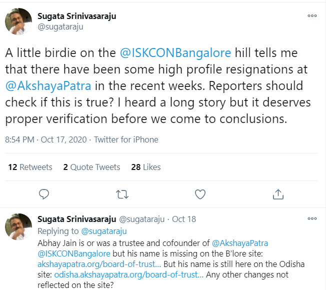ಅಕ್ಷಯಪಾತ್ರಾ ಫೌಂಡೇಷನ್ನಲ್ಲಿ ಆಡಳಿತಾತ್ಮಕ ಲೋಪಗಳು, ತಾಳೆಯಾಗದ ಲೆಕ್ಕಪತ್ರಗಳು ಮತ್ತು ಆಡಳಿತ ಮಂಡಳಿಯ ಟ್ರಸ್ಟಿಗಳಿಗೆ ಮತ್ತು ಲೆಕ್ಕಪರಿಶೋಧನಾ ಸಮಿತಿಗೆ ಉತ್ತರದಾಯಿಯಲ್ಲದ ಮತ್ತು ಕೇವಲ ಧಾರ್ಮಿಕ ಮುಖ್ಯಸ್ಥರಿಗೆ ಮಾತ್ರ ಸಂಪೂರ್ಣ ಅಧಿಕಾರ ನೀಡುವ ವ್ಯವಸ್ಥೆ ಎಂಬ ಸಂಗತಿ ಕುರಿತು ನಡೆದಿದ್ದ ಪರಿಶೋಧನೆ ಕುರಿತು ಹಿರಿಯ ಪತ್ರಕರ್ತ ಸುಗತ ಶ್ರೀನಿವಾಸರಾಜು ಅವರು ಲಭ್ಯವಿದ್ದ ಮಾಹಿತಿ ಮತ್ತು ಪತ್ರಗಳ ಆಧಾರವನ್ನಿಟ್ಟುಕೊಂಡು ಹೊರಗೆಡವಿದ್ದರು.