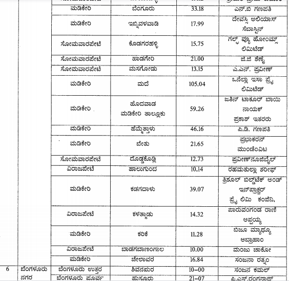 ಮಡಿಕೇರಿ ಕಡಗದಾಳುವಿನಲ್ಲಿ ತ್ರಿಶೂಲ್‌ ಬಿಲ್ಡ್‌ಟೆಕ್‌ ಇನ್ಫ್ರಾಸ್ಟಕ್ಚರ್‌ ಪ್ರೈ ಲಿ., 39.07 ಎಕರೆ, ಮಡಿಕೇರಿಯ ಹೊದವಾಡದಲ್ಲಿ ಜತಿನ್‌ ಟಾಕೂರ್‌ ಬಾಯಿ ನಾಯಕ್‌, ಪ್ರಕಾಶ್‌ ಮತ್ತಿತರರು 59.26 ಎಕರೆ, ವಿರಾಜಪೇಟೆಯ ಭದ್ರಗೋಳದಲ್ಲಿ ದ್ವಾರಕಾನಾಥರೆಡ್ಡಿ ಎಂಬುವರು 38.11 ಎಕರೆ, ಮಡಿಕೇರಿಯ ಗಾಳಿಬೀಡುವಿನಲ್ಲಿ ಪ್ರಮೋದ್‌ ರಂಜನ್‌ ಅವರು 35.30 ಎಕರೆ, ವಿರಾಜಪೇಟೆಯ ಕೊಂಗಣದಲ್ಲಿ ಪ್ರದೀಪ್‌ ಕೊಯಿಲಿ 30.77 ಎಕರೆ, ಮಡಿಕೇರಿಯ ಬೆಂಗೂರುವಿನಲ್ಲಿ ಎನ್‌ ಬಿ ಗಣಪತಿ 33.18 ಎಕರೆ, ಹೆಮ್ಮೆತ್ತಾಳುವಿನ್ಲಲಿ ಪಿ ಡಿ ಗಣಪತಿ 46.16 ಎಕರೆ, ವಿರಾಜಪೇಟೆಯ ಕೆ ಬಾಡಗದಲ್ಲಿ ಕೆ ಬಿ ಗಣಪತಿ 26.00 ಎಕರೆಯನ್ನು ಹೊಂದಿರುವುದು ಪಟ್ಟಿಯಿಂದ ಗೊತ್ತಾಗಿದೆ.