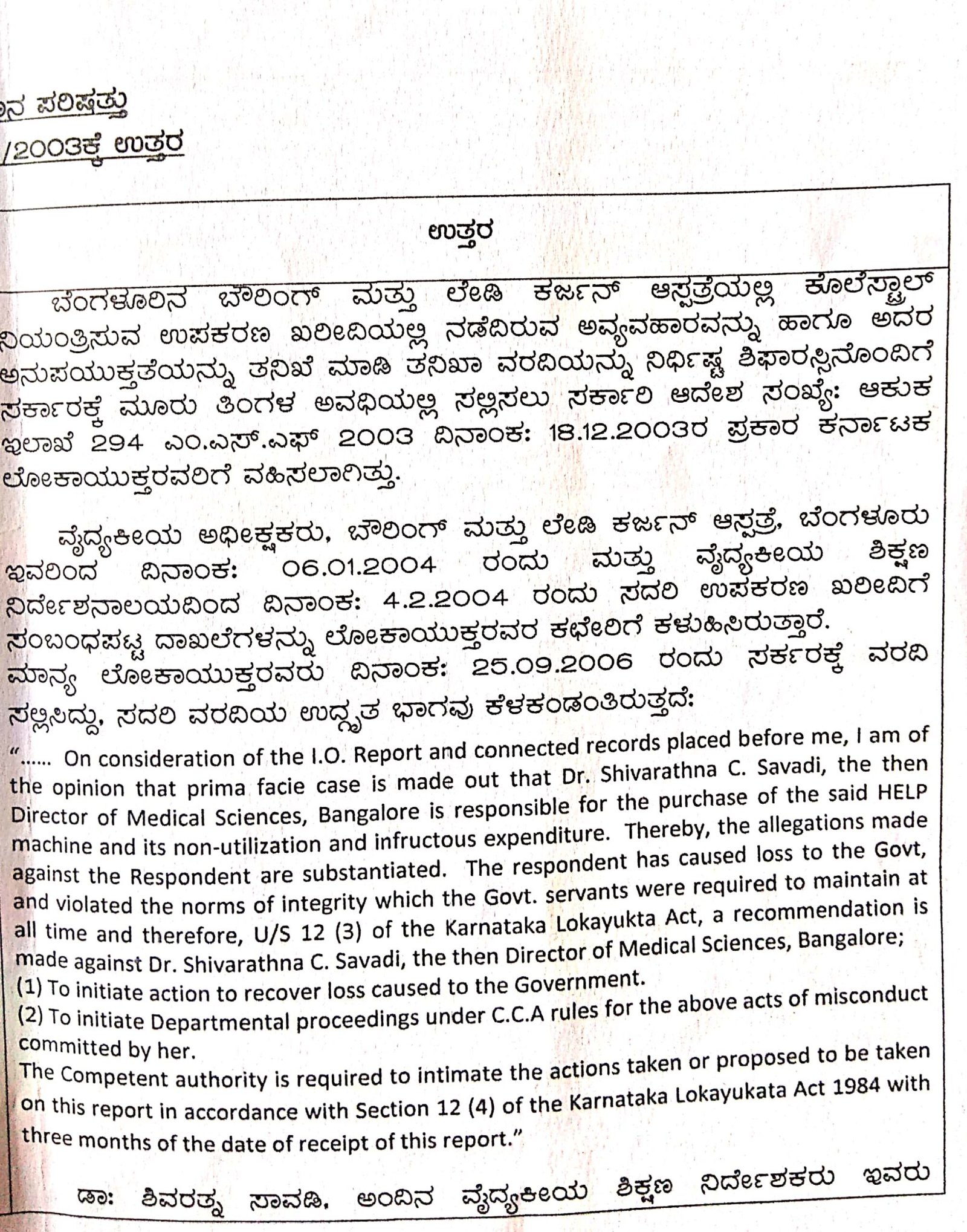 ಈ ಪ್ರಕರಣ ನಡೆದಿರುವುದು 1999ರಲ್ಲಿ. ಲೋಕಾಯುಕ್ತಕ್ಕೆ ತನಿಖೆಗೆ ವಹಿಸಿದ್ದು 2003ರಲ್ಲಿ. ಆರೋಪಗಳ ಕುರಿತು ತನಿಖೆ ನಡೆಸಿದ್ದ ಲೋಕಾಯುಕ್ತ ಸಂಸ್ಥೆಯು 2006ರಲ್ಲಿ ತನಿಖಾ ವರದಿ ಸಲ್ಲಿಸಿದೆ. ವೈದ್ಯಕೀಯ ಶಿಕ್ಷಣ ಇಲಾಖೆಯು ಪ್ರಕರಣ ಕುರಿತು ತಕ್ಷಣವೇ ಕ್ರಮ ಜರುಗಿಸಿದ್ದಲ್ಲಿ ಆಪಾದಿತ ವೈದ್ಯಕೀಯ ಶಿಕ್ಷಣ ಇಲಾಖೆಯ ನಿರ್ದೆಶಕರನ್ನು ದಂಡಿಸಲು ಸಾಧ್ಯವಿತ್ತು. ಆಪಾದಿತ ಅಧಿಕಾರಿಯು ನಿವೃತ್ತಿ ಹೊಂದುವವರೆಗೂ ಯಾವುದೇ ಕ್ರಮ ಕೈಗೊಳ್ಳದ ಇಲಾಖೆಯು ಕಾಲಹರಣ ಮಾಡಿರುವುದು ಇಲಾಖೆಯು ನೀಡಿರುವ ಉತ್ತರದಿಂದ ತಿಳಿದು ಬಂದಿದೆ.